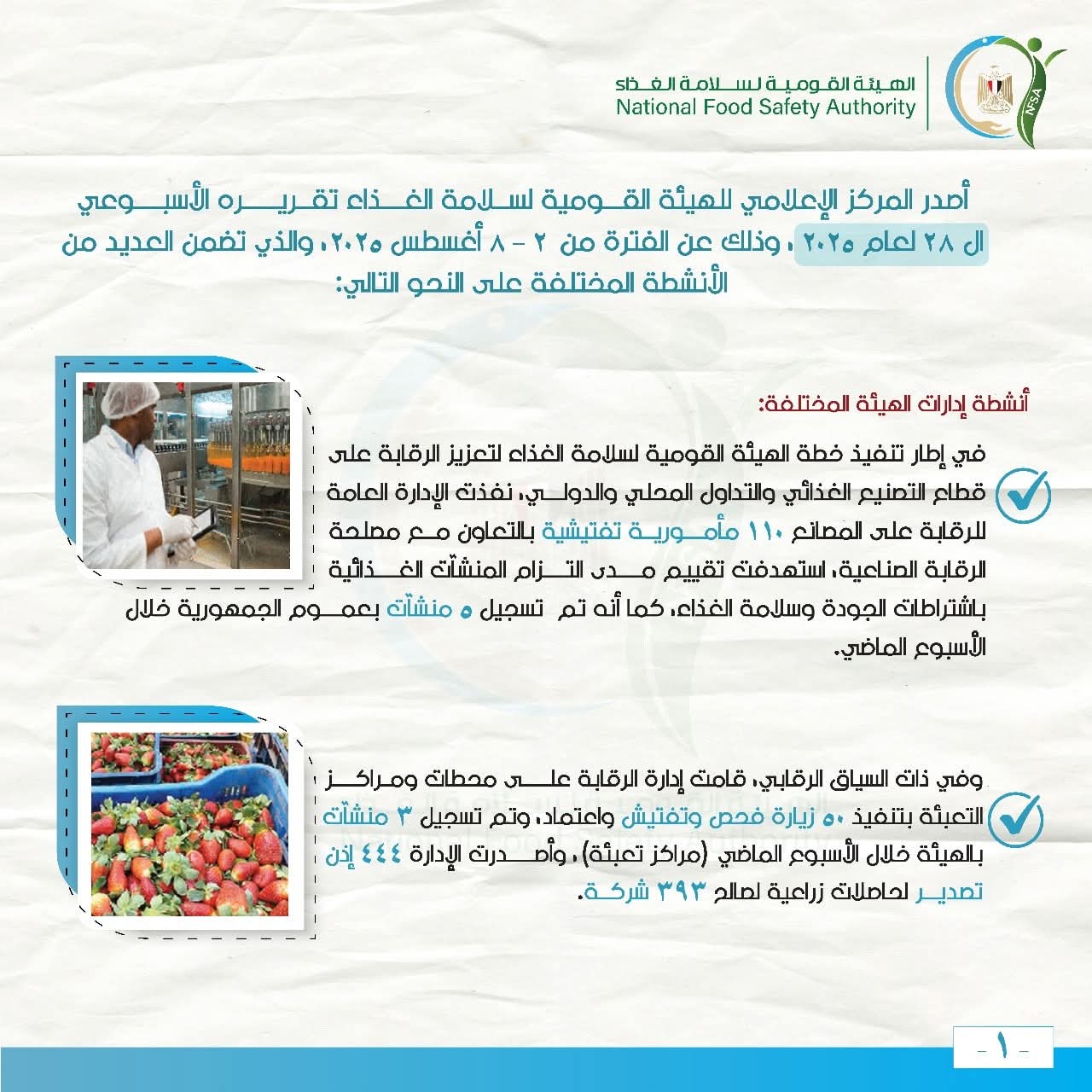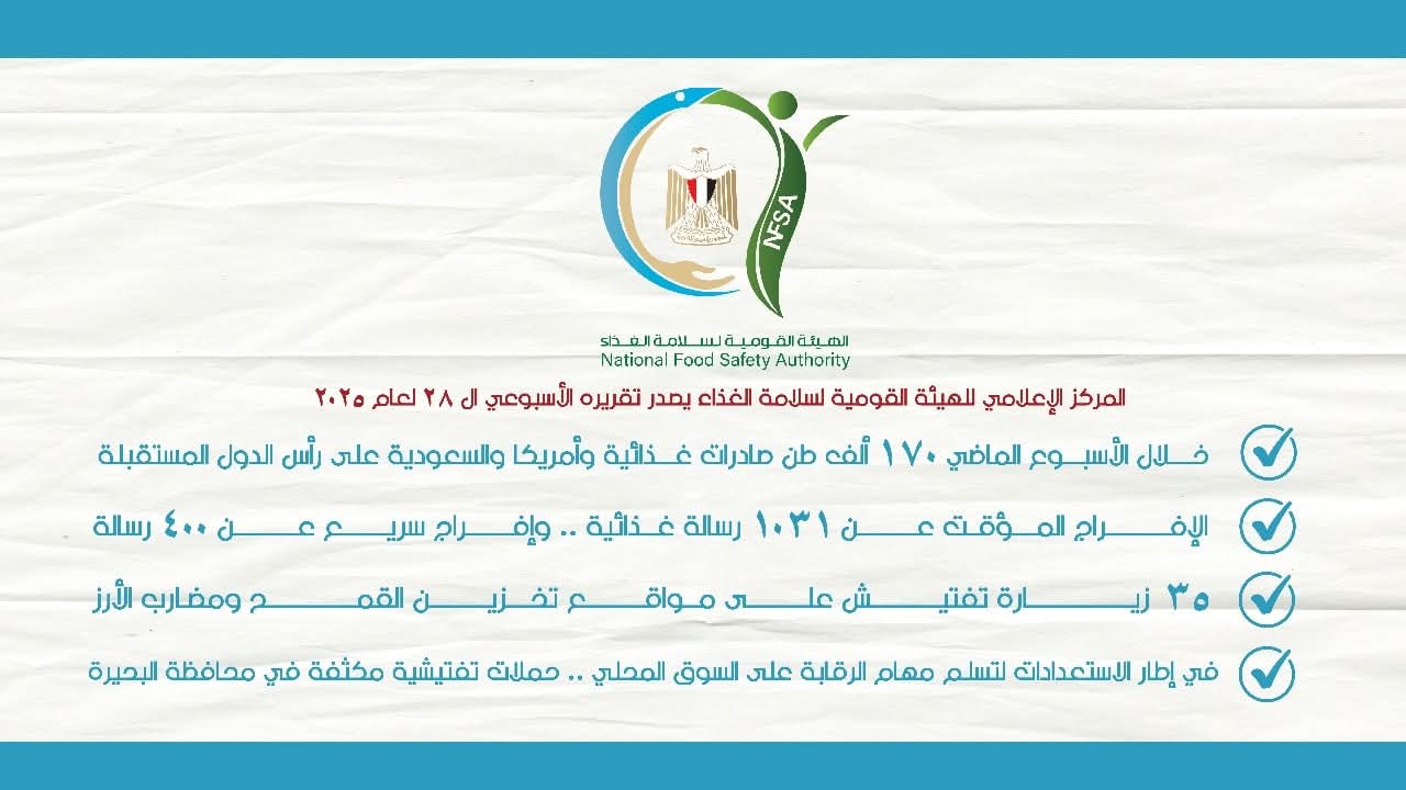 المركز الإعلامي للهيئة القومية لسلامة الغذاء يصدر تقريره الأسبوعي الـ 28 لعام 2025
