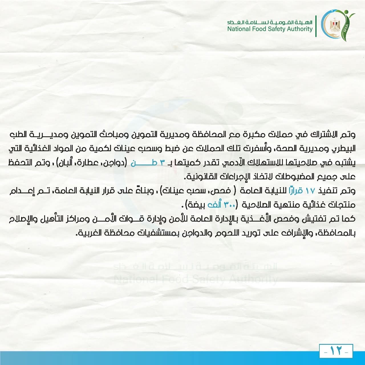 وتم تنفيذ 17 قرارًا للنيابة العامة ( فحص، سحب عينات)، وبناءً على قرار النيابة العامة، تم إعدام منتجات غذائية منتهية الصلاحية (300 ألف بيضة).
