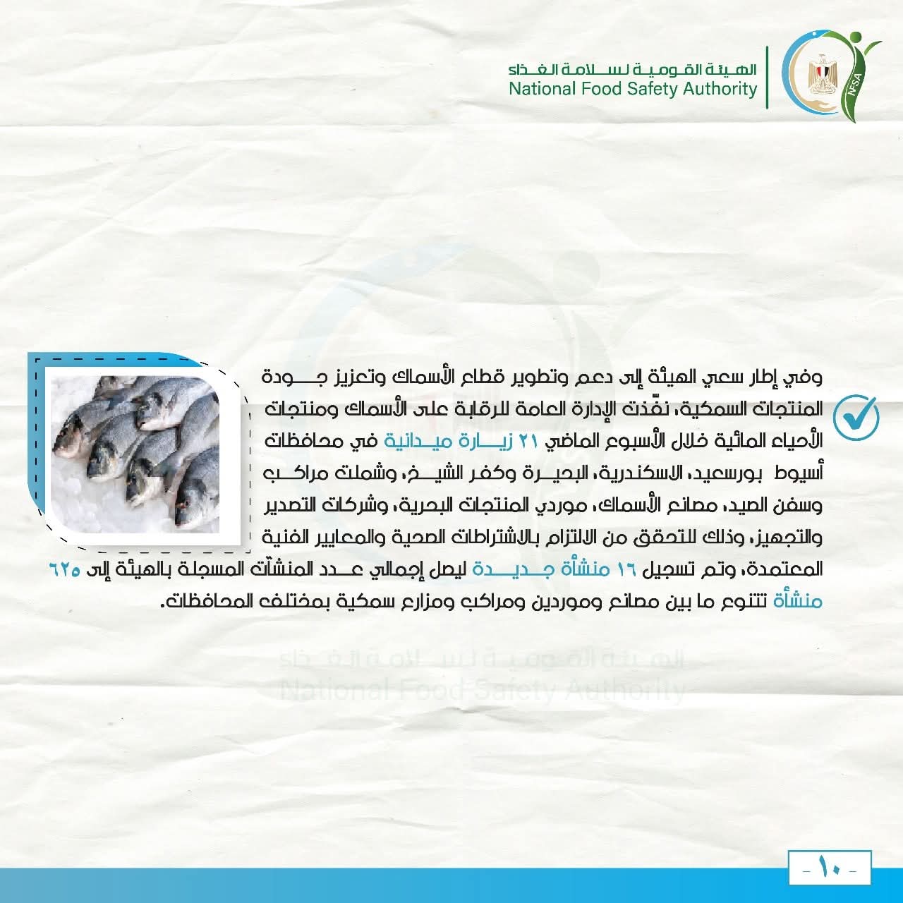 وفي إطار سعي الهيئة إلى دعم وتطوير قطاع الأسماك وتعزيز جودة المنتجات السمكية، نفّذت الإدارة العامة للرقابة على الأسماك ومنتجات الأحياء المائية خلال الأسبوع الماضي 21 زيارة ميدانية في محافظات أسيوط بورسعيد، الاسكندرية، البحيرة وكفر الشيخ، وشملت مراكب وسفن الصيد، مصانع الأسماك، موردي المنتجات البحرية، وشركات التصدير والتجهيز، وذلك للتحقق من الالتزام بالاشتراطات الصحية والمعايير الفنية المعتمدة، وتم تسجيل 16 منشأة جديدة ليصل إجمالي عدد المنشآت المسجلة بالهيئة إلى 625 منشأة تتنوع ما بين مصانع وموردين ومراكب ومزارع سمكية بمختلف المحافظات.