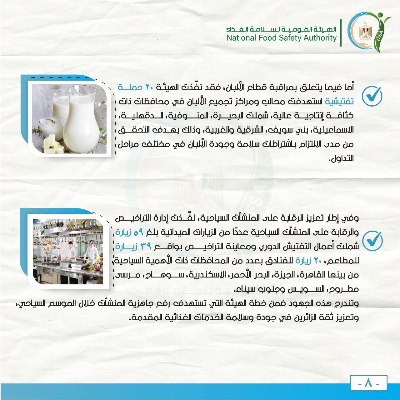 أما فيما يتعلق بمراقبة قطاع الألبان، فقد نفّذت الهيئة 20 حملة تفتيشية استهدفت محالب ومراكز تجميع الألبان في محافظات ذات كثافة إنتاجية عالية، شملت البحيرة، المنوفية، الدقهلية، الاسماعيلية، بني سويف، الشرقية والغربية، وذلك بهدف التحقق من مدى الالتزام باشتراطات سلامة وجودة الألبان في مختلف مراحل التداول.
