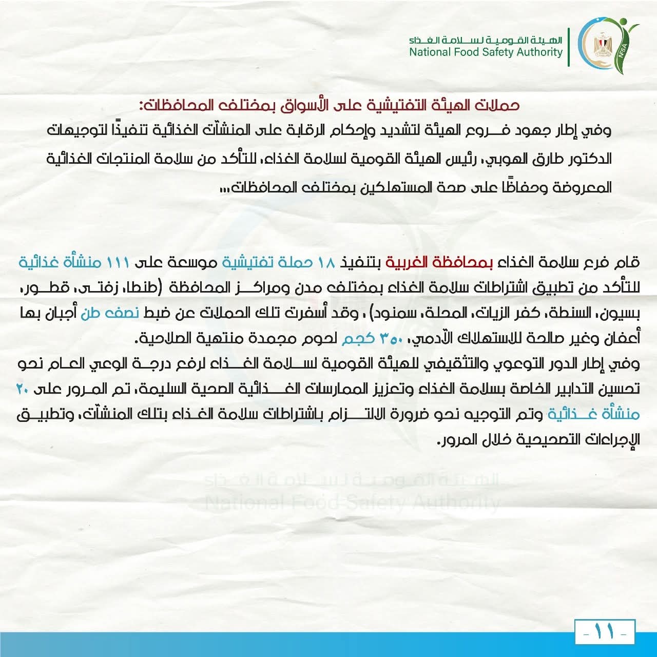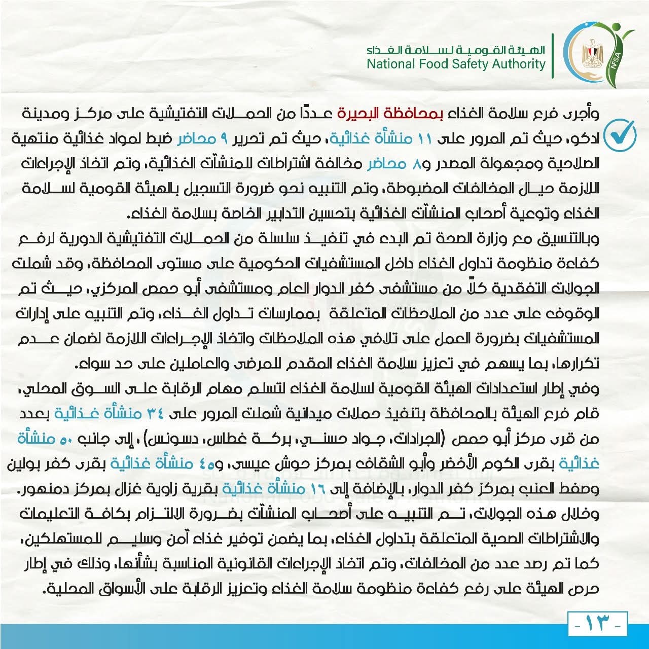 وفي إطار استعدادات الهيئة القومية لسلامة الغذاء لتسلم مهام الرقابة على السوق المحلي، قام فرع الهيئة بالمحافظة بتنفيذ حملات ميدانية شملت المرور على 34 منشأة غذائية بعدد من قرى مركز أبو حمص (الجرادات، جواد حسني، بركة غطاس، دسونس)، إلى جانب 50 منشأة غذائية بقرى الكوم الأخضر وأبو الشقاف بمركز حوش عيسى، و45 منشأة غذائية بقرى كفر بولين وصفط العنب بمركز كفر الدوار، بالإضافة إلى 16 منشأة غذائية بقرية زاوية غزال بمركز دمنهور.
