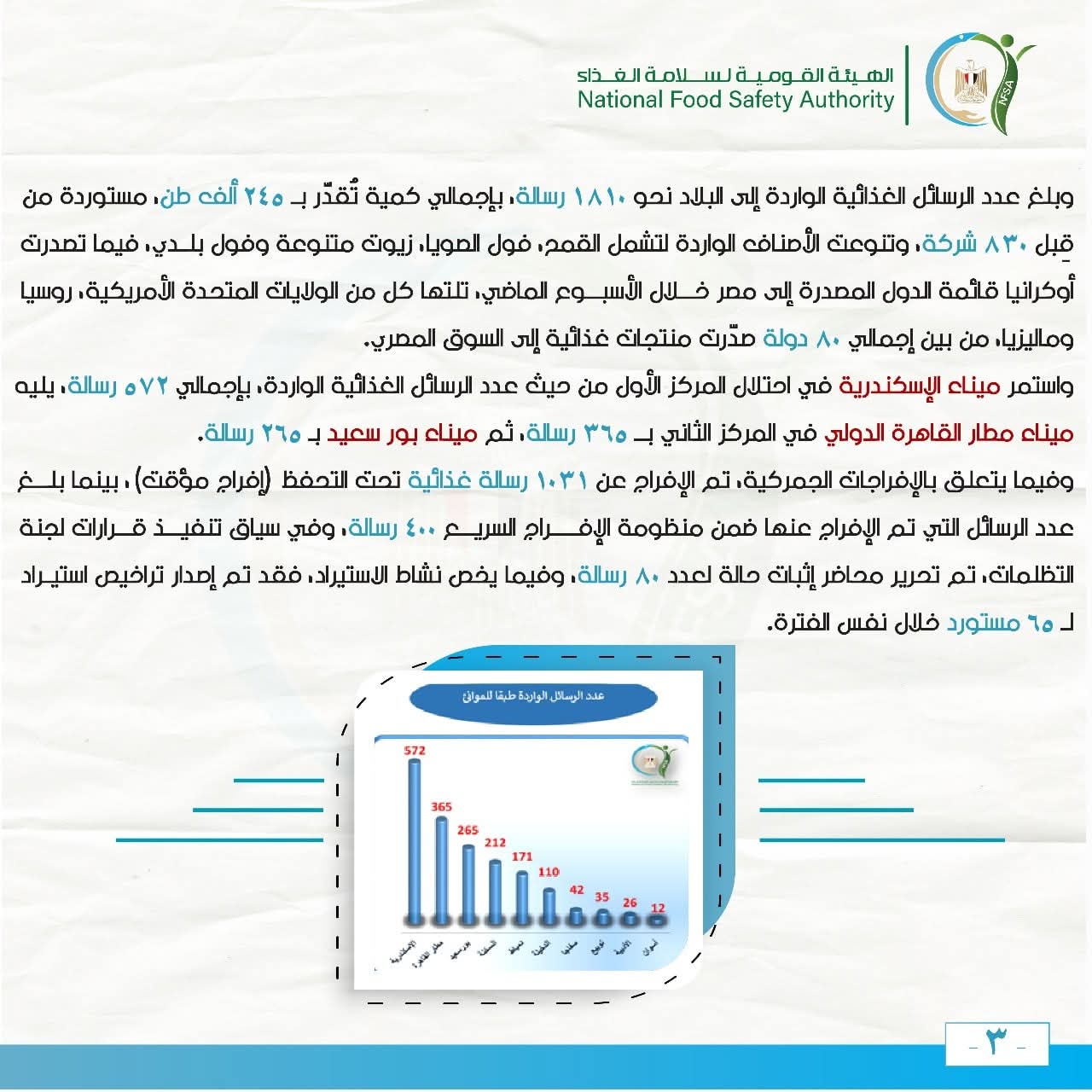 واستمر ميناء الإسكندرية في احتلال المركز الأول من حيث عدد الرسائل الغذائية الواردة، بإجمالي 572 رسالة، يليه ميناء مطار القاهرة الدولي في المركز الثاني بـــ 365 رسالة، ثم ميناء بور سعيد بـ 265 رسالة.