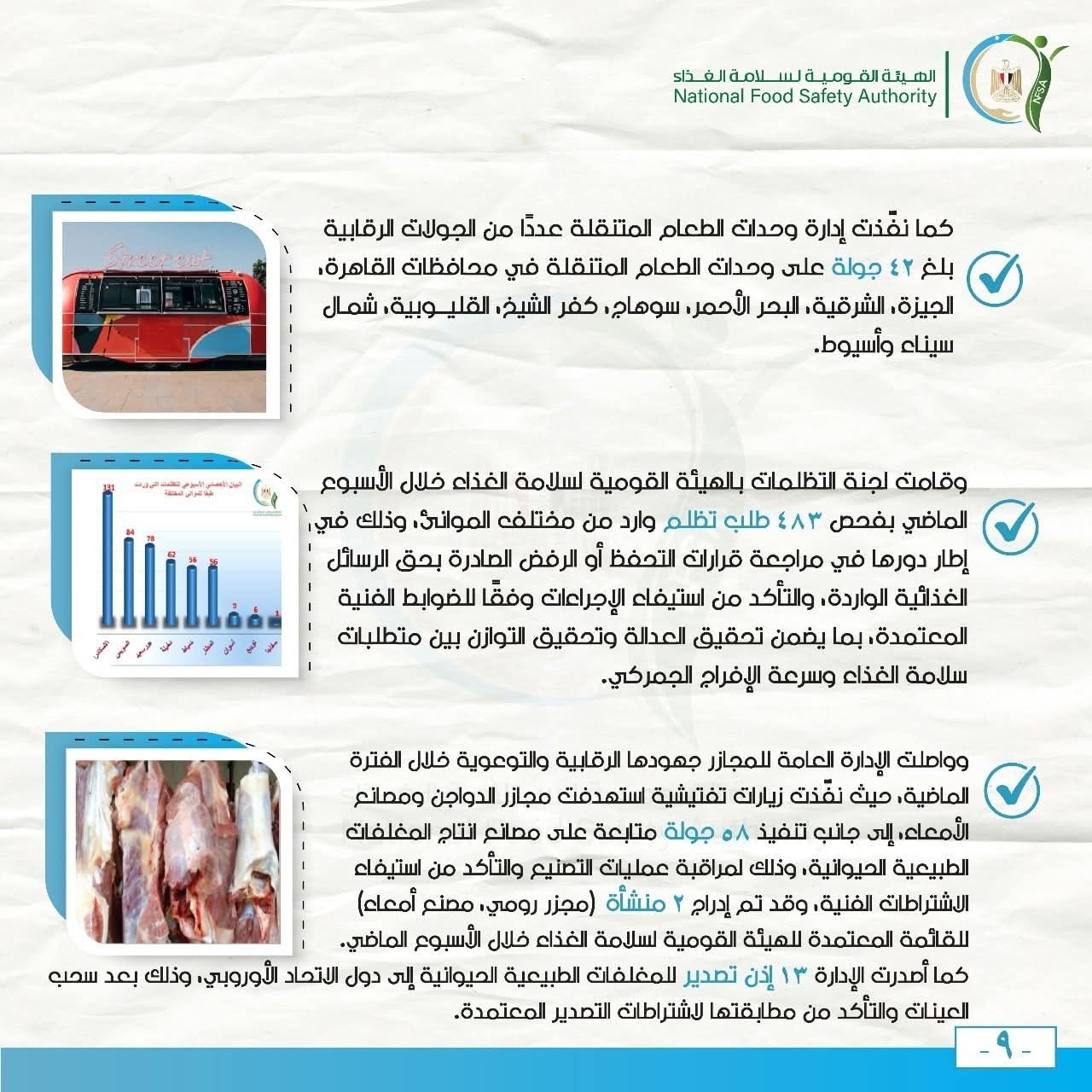 كما نفّذت إدارة وحدات الطعام المتنقلة عددًا من الجولات الرقابية بلغ 42 جولة على وحدات الطعام المتنقلة في محافظات القاهرة، الجيزة، الشرقية، البحر الأحمر، سوهاج، كفر الشيخ، القليوبية، شمال سيناء وأسيوط.