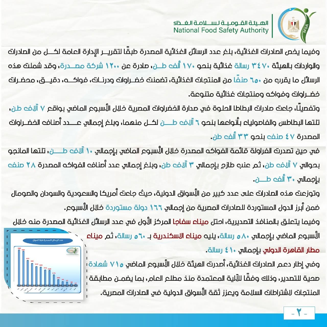 وفيما يتعلق بالمنافذ التصديرية، احتل ميناء سفاجا المركز الأول في عدد الرسائل الغذائية المصدرة منه خلال الأسبوع الماضي بإجمالي 580 رسالة، يليه ميناء الاسكندرية بـ 560 رسالة، ثم ميناء مطار القاهرة الدولي بإجمالي 410 رسالة.
