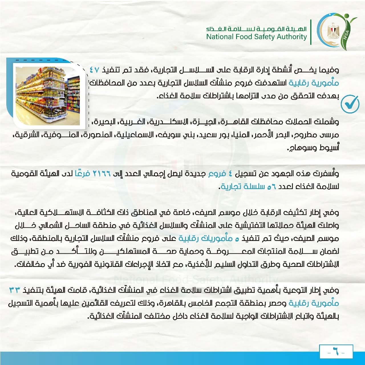 وأسفرت هذه الجهود عن تسجيل 4 فروع جديدة ليصل إجمالي العدد إلى 2166 فرعًا لدى الهيئة القومية لسلامة الغذاء لعدد 56 سلسلة تجارية.