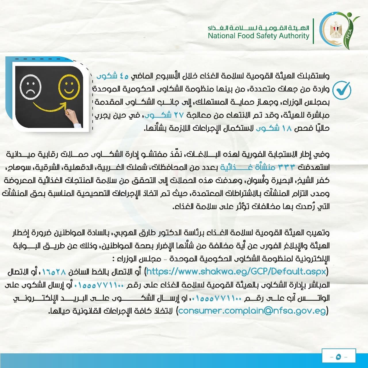 واستقبلت الهيئة القومية لسلامة الغذاء خلال الأسبوع الماضي 45 شكوى واردة من جهات متعددة، من بينها منظومة الشكاوى الحكومية الموحدة بمجلس الوزراء، وجهاز حماية المستهلك، إلى جانب الشكاوى المقدمة مباشرة للهيئة، وقد تم الانتهاء من معالجة 27 شكوى، في حين يجري حاليًا فحص 18 شكوى لاستكمال الإجراءات اللازمة بشأنها.