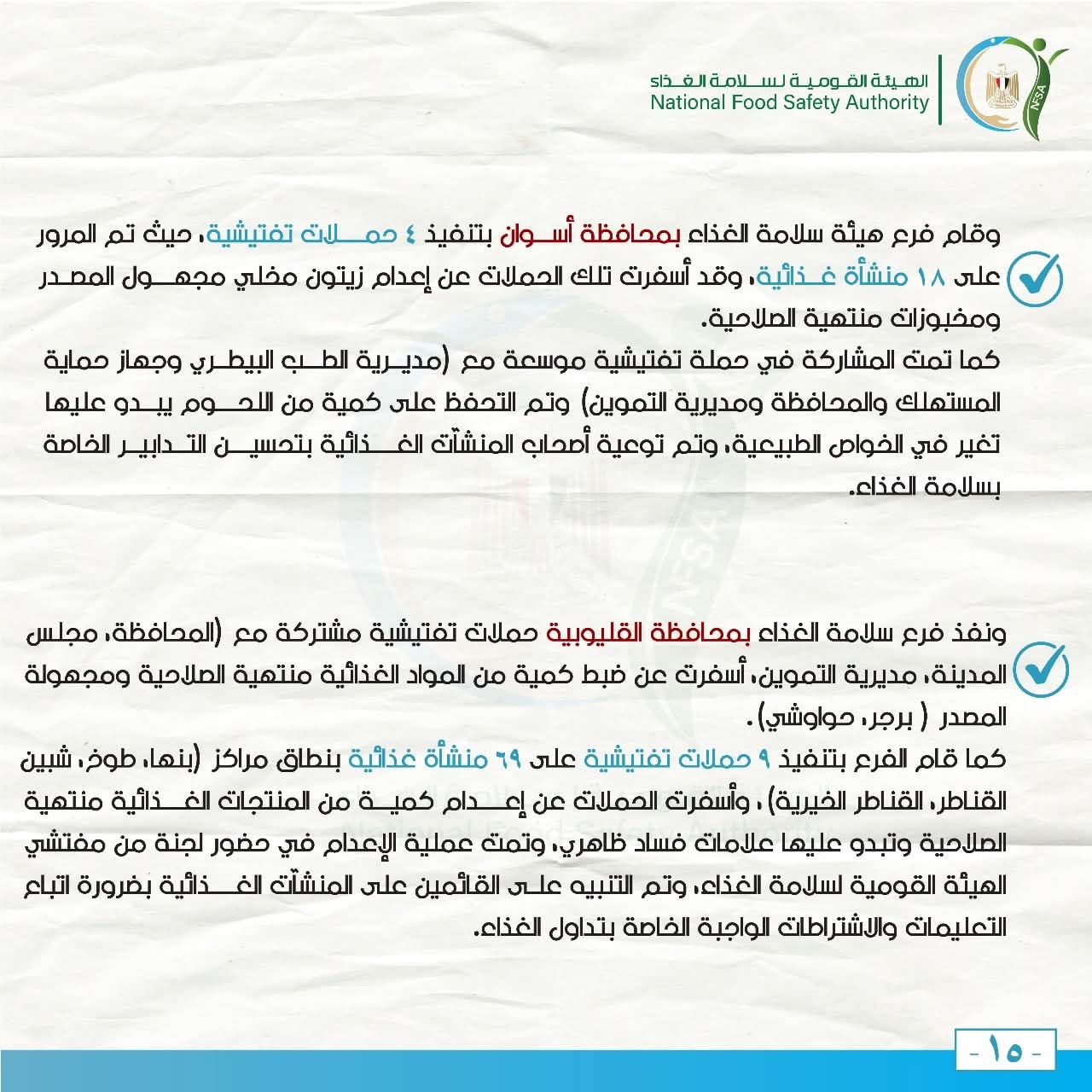 كما قام الفرع بتنفيذ 9 حملات تفتيشية على 69 منشأة غذائية بنطاق مراكز (بنها، طوخ، شبين القناطر، القناطر الخيرية)، وأسفرت الحملات عن إعدام كمية من المنتجات الغذائية منتهية الصلاحية وتبدو عليها علامات فساد ظاهري، وتمت عملية الإعدام في حضور لجنة من مفتشي الهيئة القومية لسلامة الغذاء، وتم التنبيه على القائمين على المنشآت الغذائية بضرورة اتباع التعليمات والاشتراطات الواجبة الخاصة بتداول الغذاء.