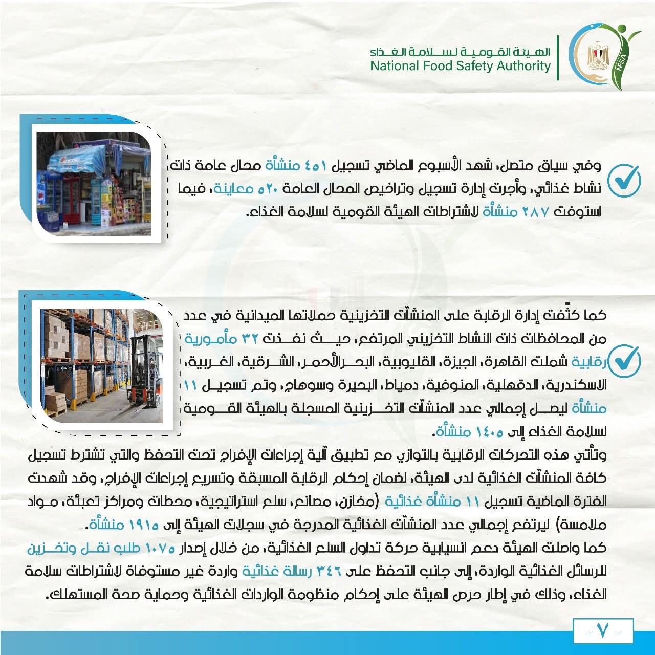 كما كثّفت إدارة الرقابة على المنشآت التخزينية حملاتها الميدانية في عدد من المحافظات ذات النشاط التخزيني المرتفع، حيث نفذت 32 مأمورية رقابية شملت القاهرة، الجيزة، القليوبية، البحرالأحمر، الشرقية، الغربية، الاسكندرية، الدقهلية، المنوفية، دمياط، البحيرة وسوهاج، وتم تسجيل 11 منشأة ليصل إجمالي عدد المنشآت التخزينية المسجلة بالهيئة القومية لسلامة الغذاء إلى 1405 منشأة.