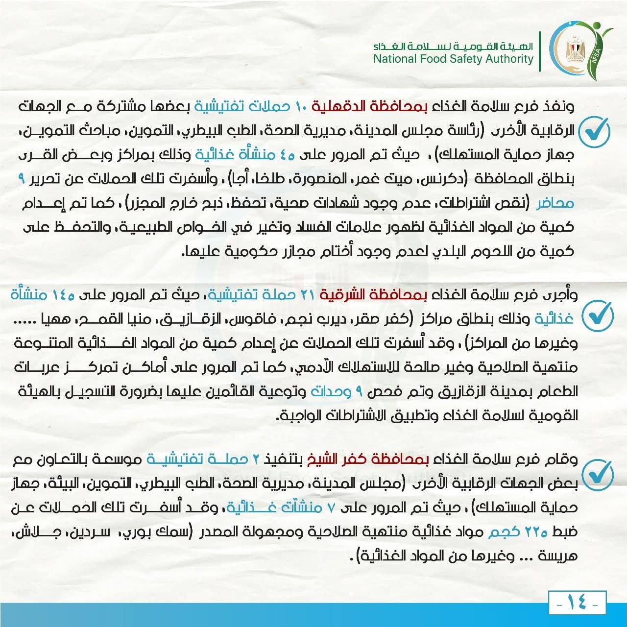 وقام فرع سلامة الغذاء بمحافظة كفر الشيخ بتنفيذ 2 حملة تفتيشية موسعة بالتعاون مع بعض الجهات الرقابية الأخرى (مجلس المدينة، مديرية الصحة، الطب البيطري، التموين، البيئة، جهاز حماية المستهلك)، حيث تم المرور على 7 منشآت غذائية، وقد أسفرت تلك الحملات عن ضبط 225 كجم مواد غذائية منتهية الصلاحية ومجهولة المصدر (سمك بوري، سردين، جلاش، هريسة ... وغيرها من المواد الغذائية).