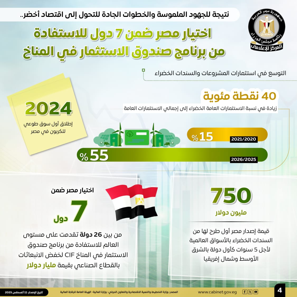 نشر المركز الإعلامي لمجلس الوزراء عددًا من الإنفوجرافات عبر منصاته على مواقع التواصل الاجتماعي، سلط من خلالها الضوء على اختيار مصر ضمن 7 دول للاستفادة من برنامج صندوق الاستثمار في المناخ "CIF"، وذلك نتيجة للجهود الملموسة والخطوات الجادة التي تنفذها الدولة في إطار التحول نحو الاقتصاد الأخضر.
