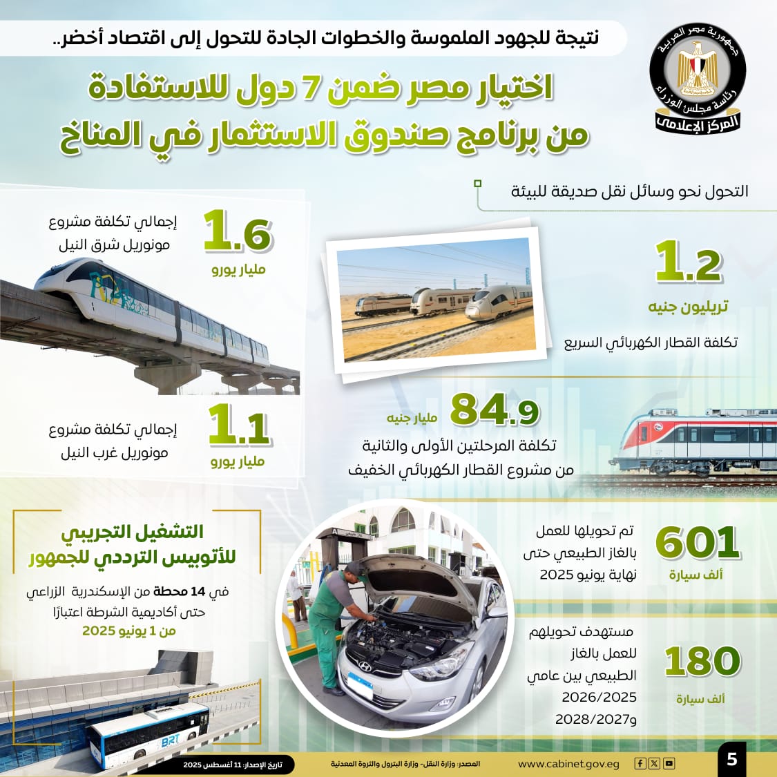 أما على صعيد التحول نحو وسائل نقل صديقة للبيئة، فقد بلغت تكلفة القطار الكهربائي السريع 1.2 تريليون جنيه، فيما بلغت تكلفة المرحلتين الأولى والثانية من مشروع القطار الكهربائي الخفيف 84.9 مليار جنيه، كما بلغ إجمالي تكلفة مشروع مونوريل شرق النيل 1.6 مليار يورو، ومونوريل غرب النيل 1.1 مليار يورو.