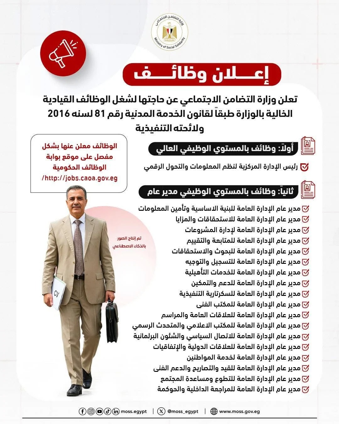 أعلنت وزارة التضامن الاجتماعي عن حاجتها لشغل الوظائف القيادية الخالية بالوزارة طبقا لقانون الخدمة المدنية رقم 81 لسنه 2016 ولائحته التنفيذية .