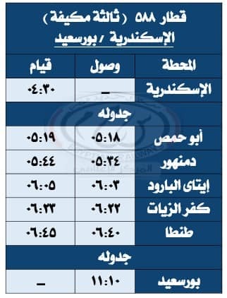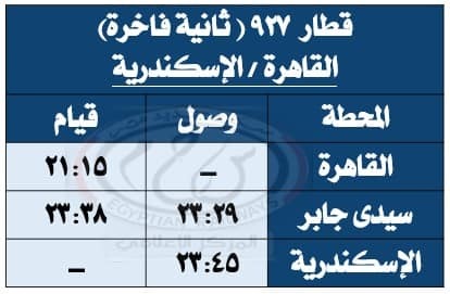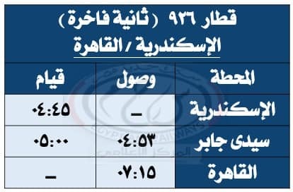 وقررت الهيئة اعتباراً من يوم الثلاثاء الموافق 12 / 8 / 2025 تشغيل قطار 927 ( ثانية فاخرة) القاهرة / الإسكندرية حيث يقوم من القاهرة الساعة 21:15 ويصل الإسكندرية الساعة 23:45 طبقاً للجدول المرفق ، واعتباراً من يوم الأربعاء الموافق 13 / 8 / 2025 تشغيل قطار 926 ( ثانية فاخرة ) الإسكندرية / القاهرة حيث يقوم من الإسكندرية الساعة 04:45 ويصل القاهرة الساعة 07:15 طبقاً للجدول المرفق
