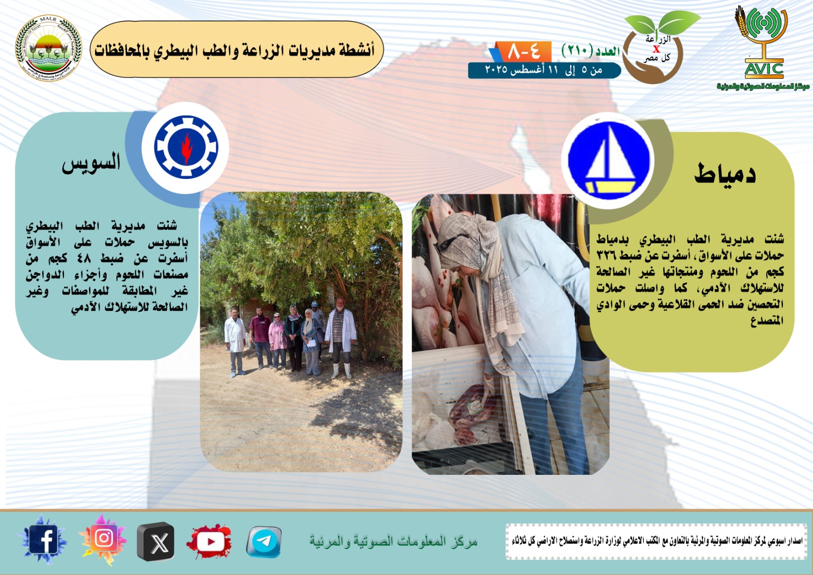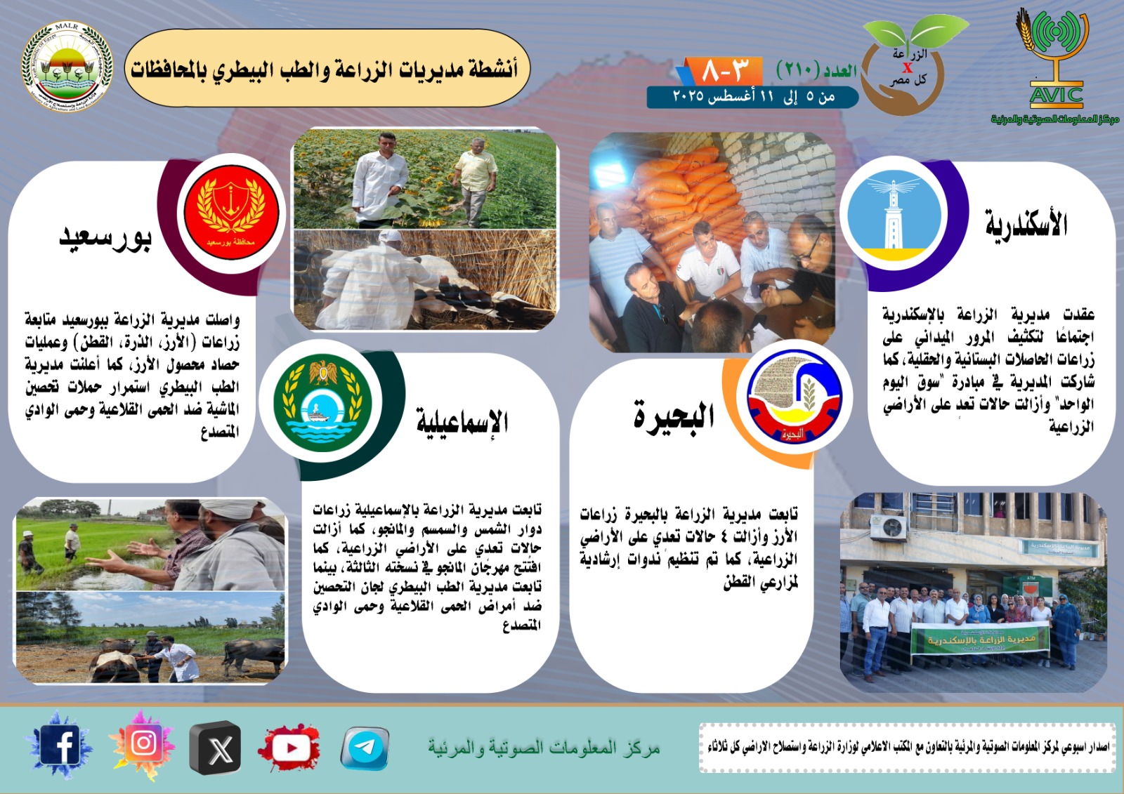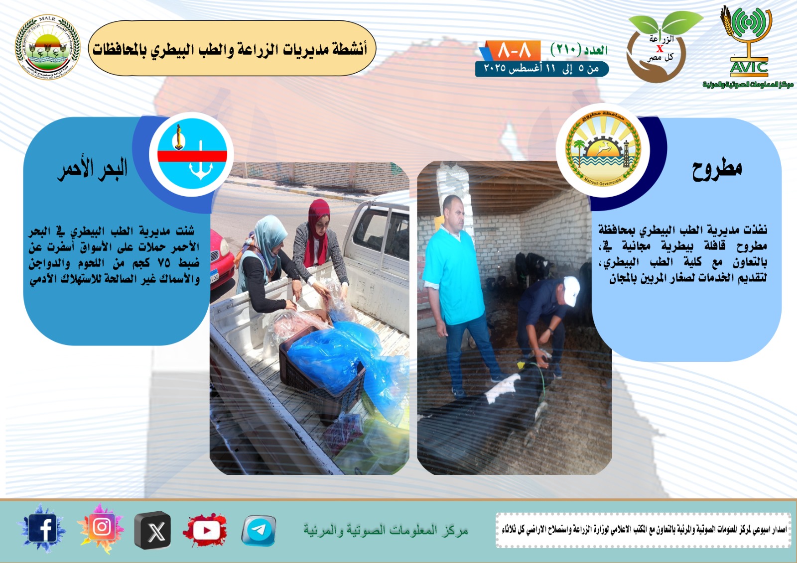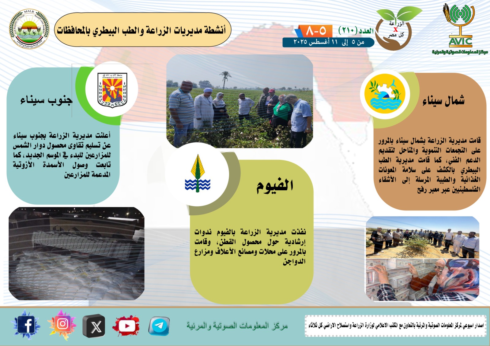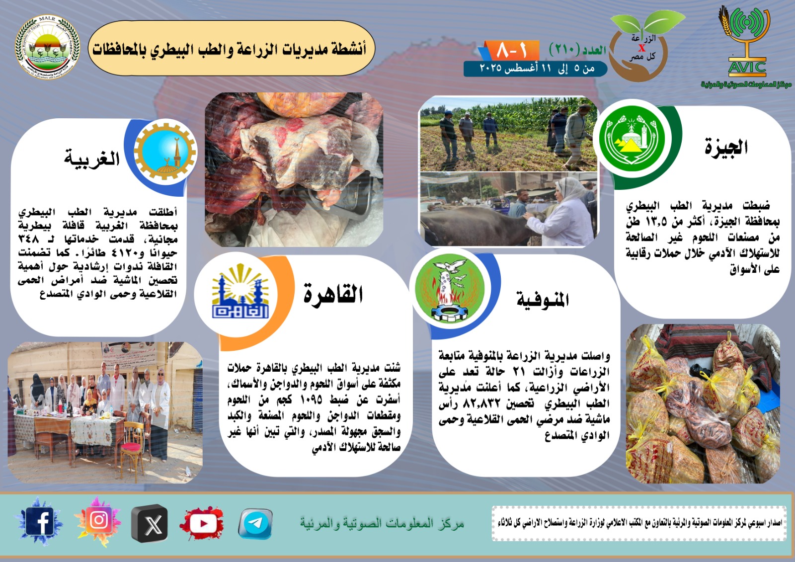 أصدر مركز المعلومات الصوتية والمرئية التابع لوزارة الزراعة واستصلاح الأراضي، والمكتب الاعلامي للوزارة، العدد رقم 210 من اصدار: "الزراعة في كل مصر" بالانفوجراف والفيديو، يوضح الجهود والانشطة التي تقوم بها مديريات الزراعة والطب البيطري بمحافظات الجمهورية خلال الفترة من 5 وحتى 11 اغسطس الجاري.