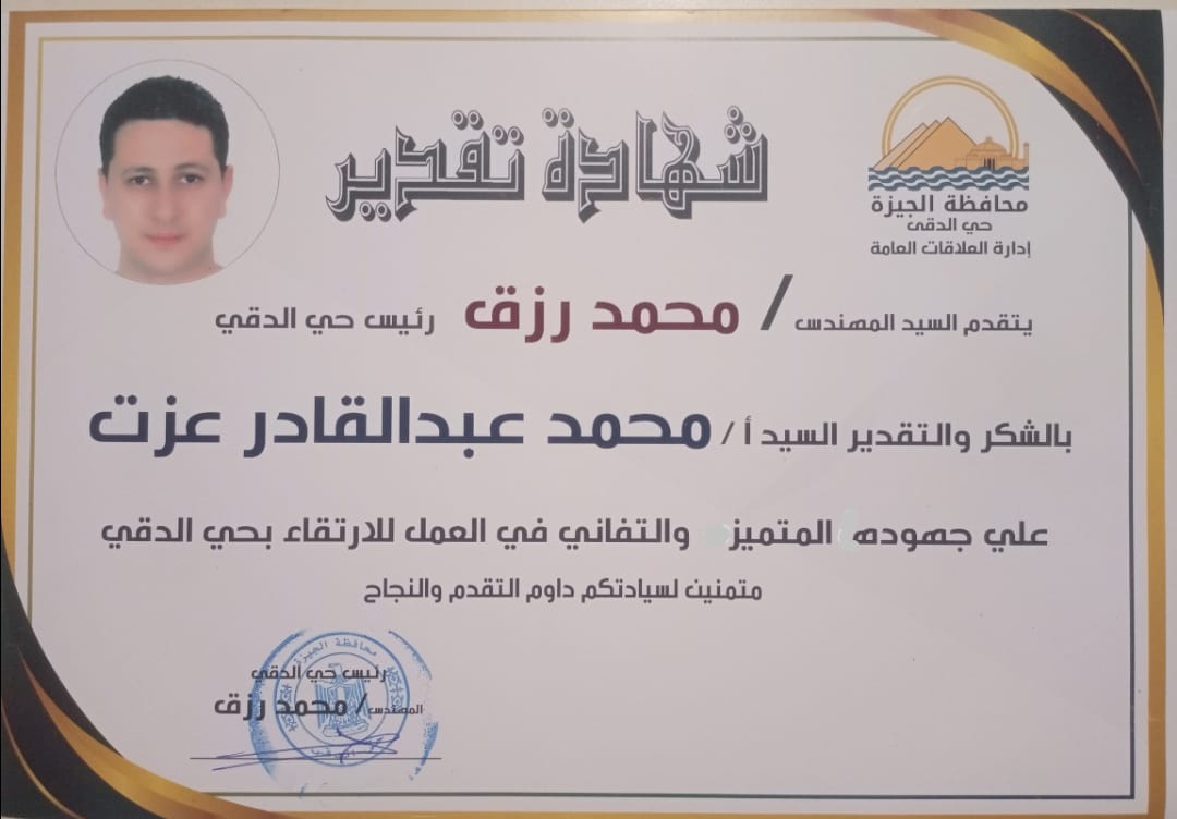 في إطار حرصه على تحفيز الكفاءات وتشجيع التميز الوظيفي، قام المهندس محمد رزق، رئيس حي الدقي، بتكريم السيد محمد عبد القادر عزت، إلى جانب عدد من العاملين المتميزين بالحي، تقديرًا لجهودهم الكبيرة وإخلاصهم في أداء مهامهم.