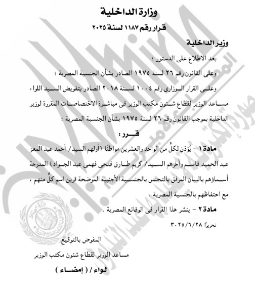نشرت الجريدة الرسمية صباح اليوم، قرار وزارة الداخلية بالإذن لـ42 شخصأ بالتجنس بجنسيات أجنبية المرفقة مقابل كل اسم في الكشف التالي، صدر القرار بعد الاطلاع على القانون رقم 26 لسنة 1975 الصادر بشأن الجنسية المصرية.