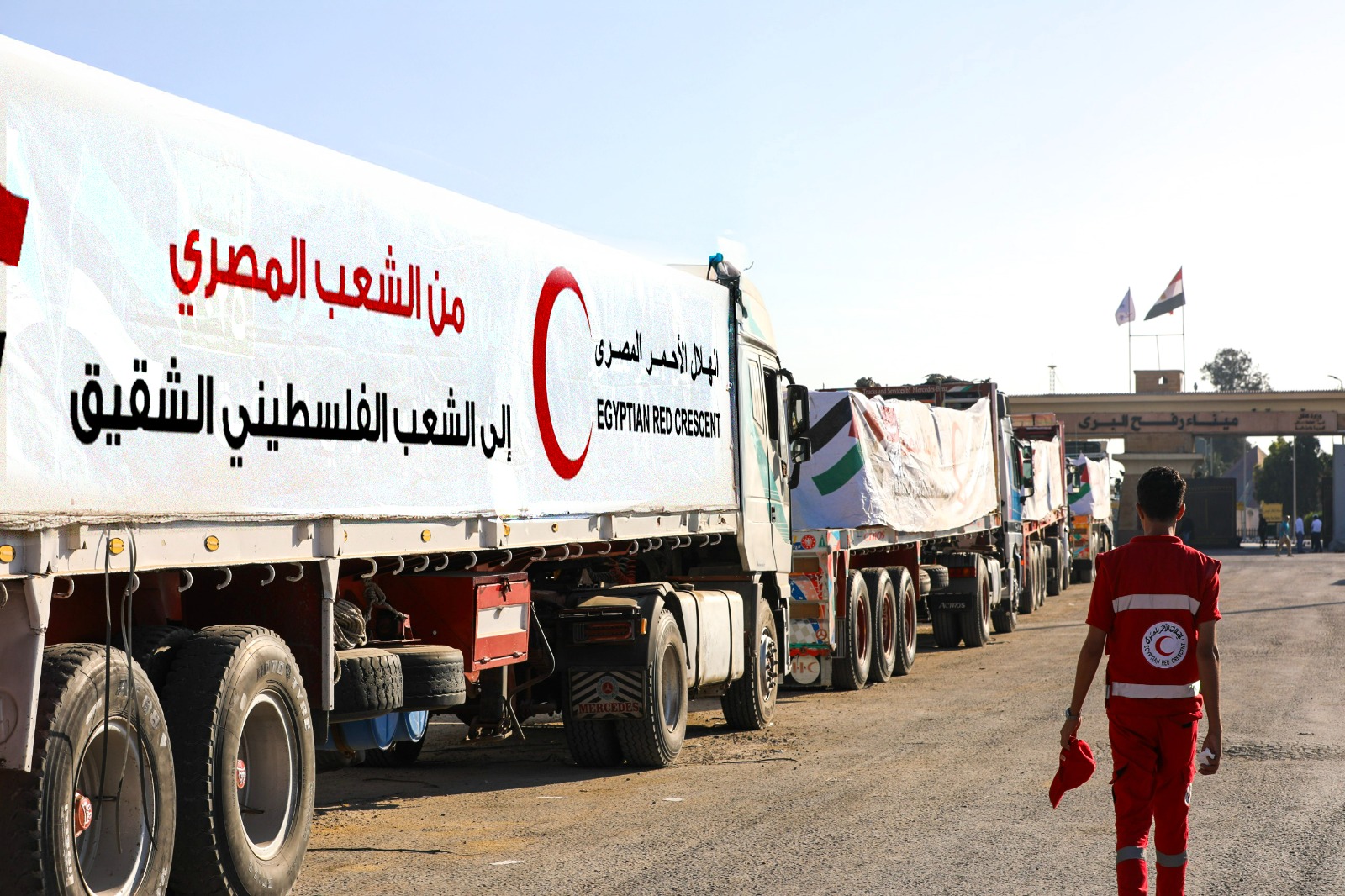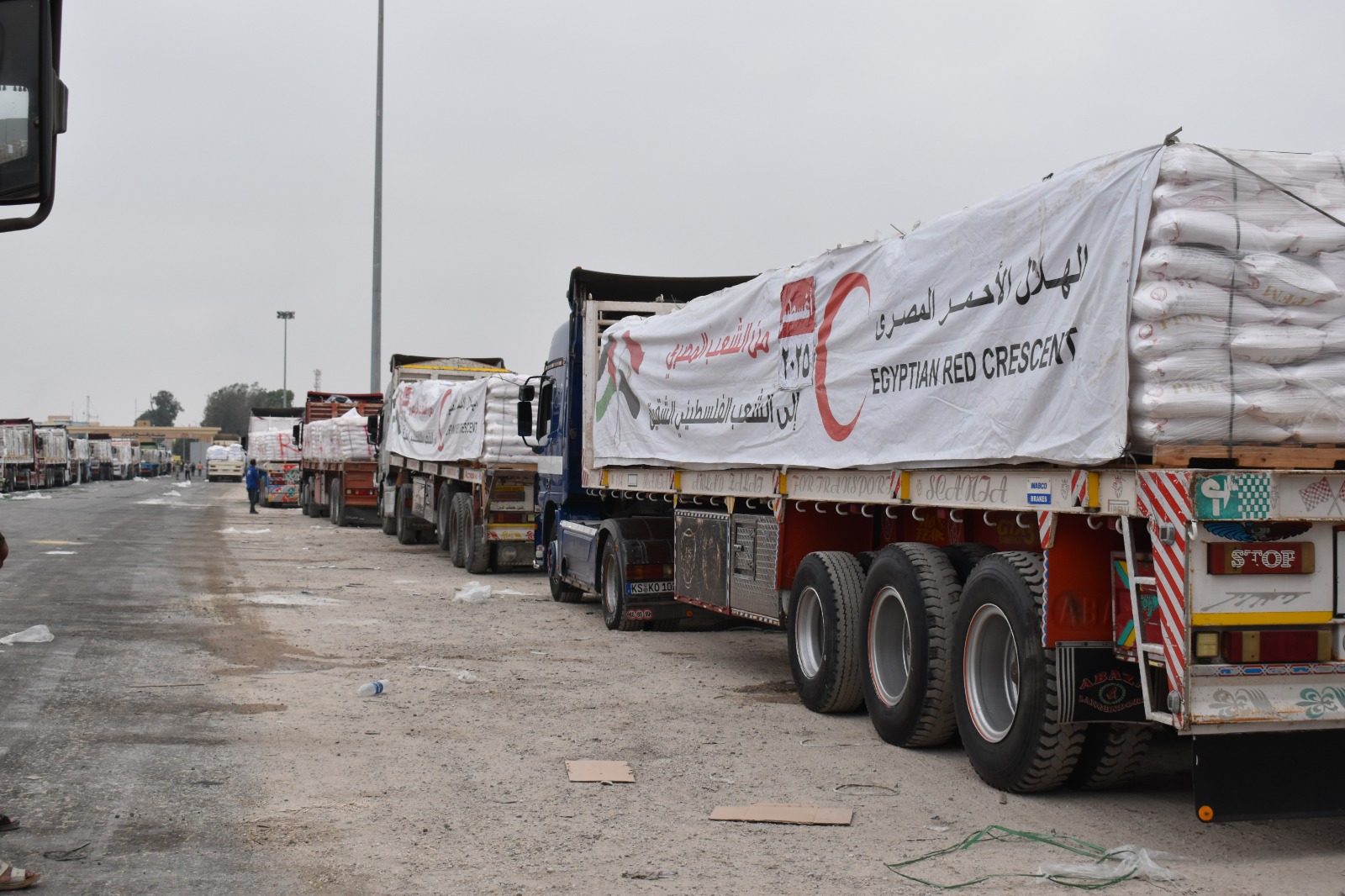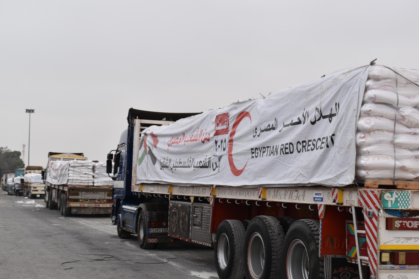 ويتواجد الهلال الأحمر المصري كآلية وطنية لتنسيق وتفويج المساعدات إلى غزة، على الحدود منذ بدء الأزمة حيث لم يتم غلق معبر رفح من الجانب المصري نهائيًا، وواصل تأهبه فى كافة المراكز اللوجستية وجهوده المتواصلة لدخول المساعدات التي بلغت أكثر من 36 ألف شاحنة محملة بنحو نصف مليون طن من المساعدات الإنسانية و الإغاثة، وذلك بجهود 35 ألف متطوع بالجمعية.