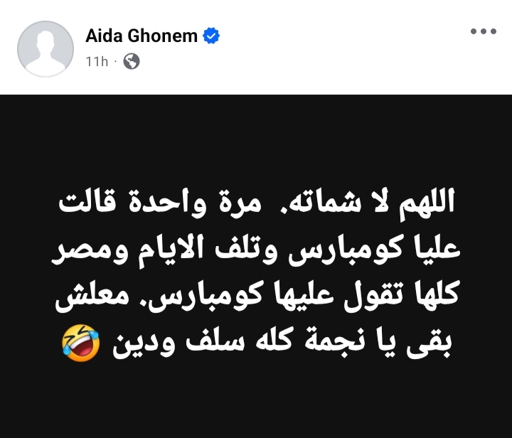 كتبت عايدة غنيم من خلال حسابها الرسمي عبر موقع التواصل الاجتماعي فيسبوك، قائلةً: "اللهم لا شماته.. مرة واحدة قالت عليا كومبارس وتلف الأيام ومصر كلها تقول عليها كومبارس.. معلش بقى يا نجمة كله سلف ودين".