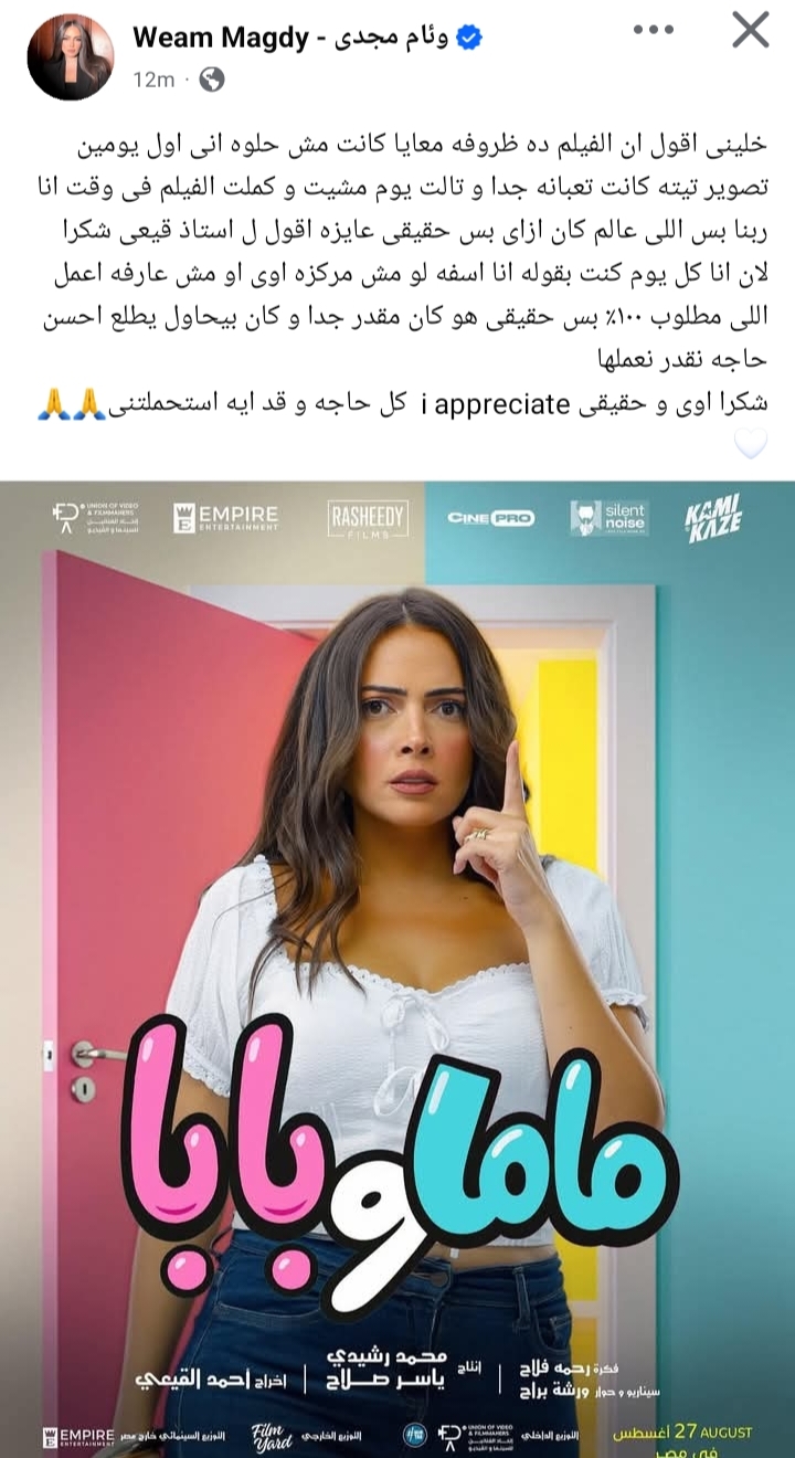 كشفت الفنانة وئام مجدي عن الظروف الصعبة التي مرت بها في أثناء تصوير فيلم "ماما وبابا"، الذي تشارك في بطولته بجانب الفنانة ياسمين رئيس والفنان محمد عبد الرحمن، ومن المقرر طرحه خلال الفترة المقبلة في دور العرض السينمائي، كما وجهت رسالة شكر لمخرج العمل أحمد القيعي.