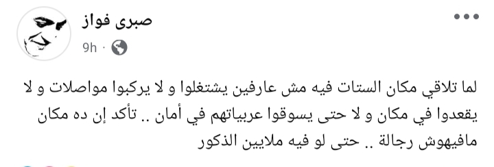 كتب صبري فواز من خلال حسابه الرسمي عبر موقع التواصل الاجتماعي "فيسبوك"، قائلًا: "لما تلاقي مكان الستات فيه مش عارفين يشتغلوا و لا يركبوا مواصلات و لا يقعدوا في مكان و لا حتى يسوقوا عربياتهم في أمان.. تأكد إن ده مكان مافيهوش رجالة.. حتى لو فيه ملايين الذكور".