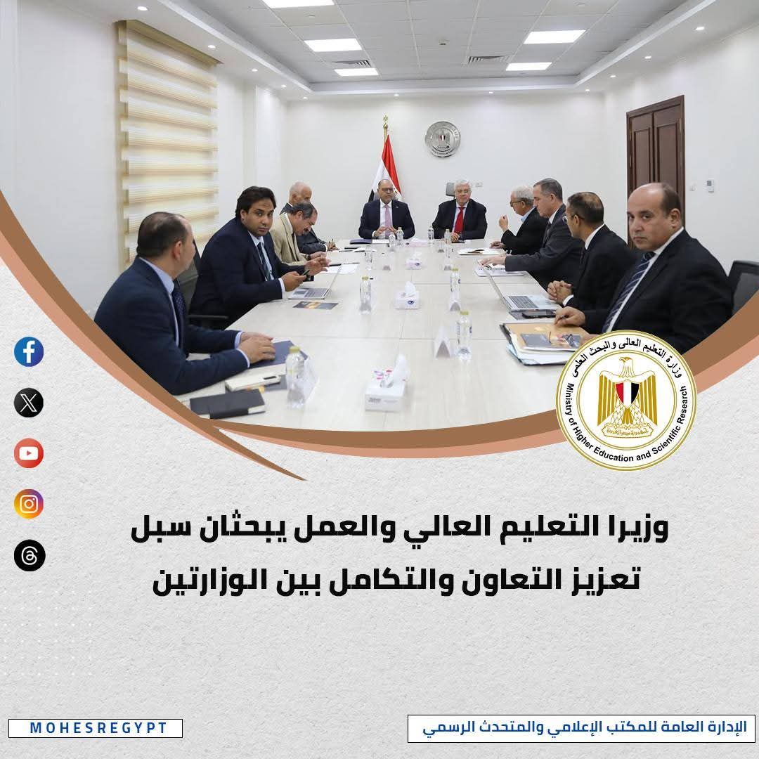 عقد الدكتور أيمن عاشور وزير التعليم العالي والبحث العلمي، والسيد/ محمد جبران وزير العمل، اجتماعًا لبحث سبل تعزيز التعاون بين الوزارتين، وأشار الوزير إلى حجم التوسع الكبير الذي شهدته منظومة التعليم العالي المصرية خلال السنوات الأخيرة، من خلال إنشاء جامعات جديدة أو فتح أفرع لجامعات أجنبية، أو منح درجات علمية مزدوجة بالتعاون مع الجامعات الدولية المرموقة، لافتًا إلى تنوع روافد منظومة التعليم العالى المصرية ما بين جامعات حكومية وخاصة وأهلية وتكنولوجية، وأفرع للجامعات الأجنبية، وتنوع المسارات التعليمية التي تلبي احتياجات سوق العمل المتغير على مستوى العالم، مؤكدًا حرص الوزارة على تعزيز التعاون الأكاديمي والبحثي بين المؤسسات التعليمية والبحثية، ودعم سبل التواصل بين الجانبين بما يفتح آفاقًا أوسع للشراكة العلمية والأكاديمية التي تخدم أولويات البلدين وتُسهم في بناء القدرات البشرية، وخلال الاجتماع، بحث الجانبان سبل تعزيز التعاون والتكامل المشترك بين الوزارتين، بما يعود بالنفع على تعزيز قدرات الطلاب والخريجين وتأهيلهم لتلبية متطلبات سوق العمل.