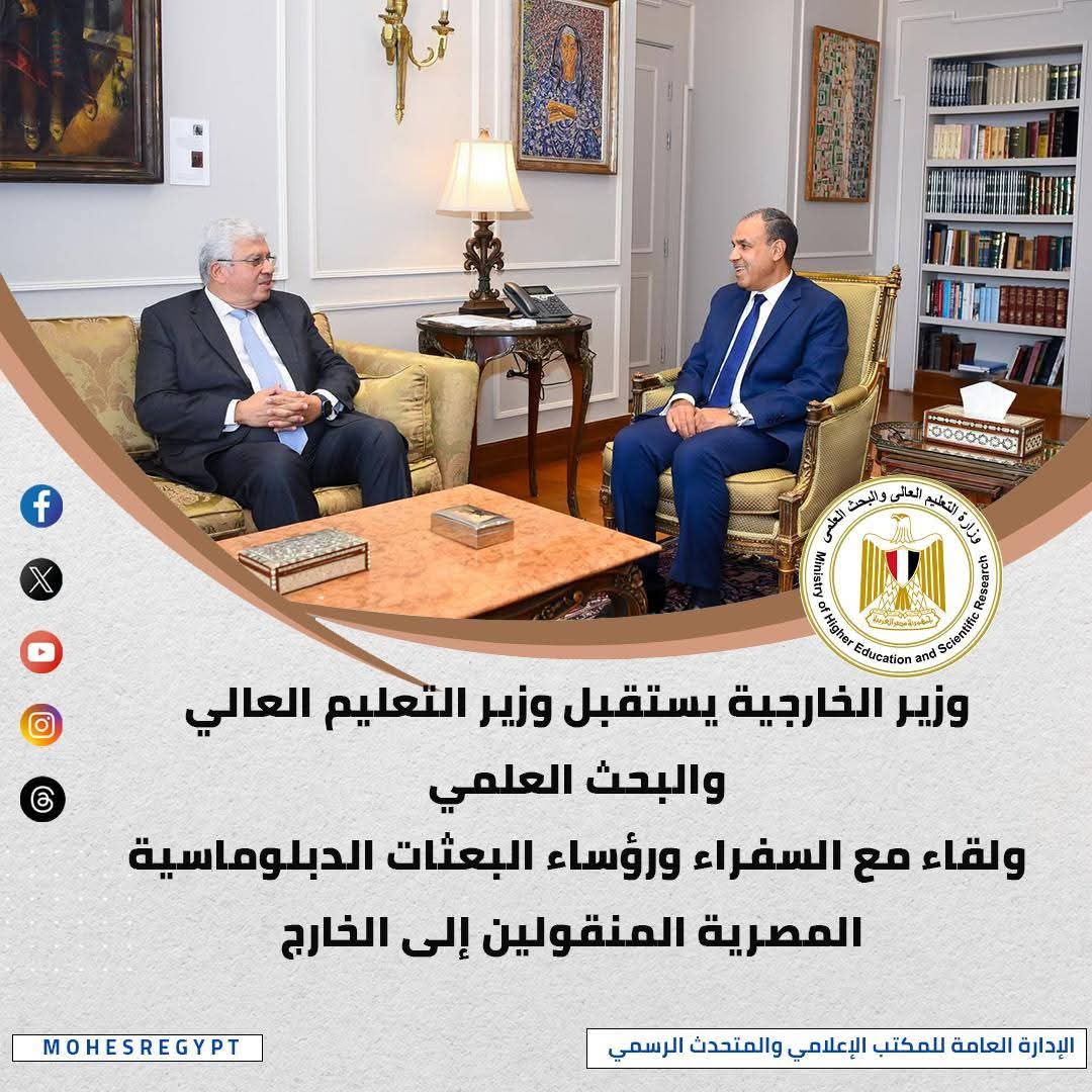 استقبل د. بدر عبد العاطي وزير الخارجية والهجرة وشئون المصريين، د. محمد أيمن عاشور، وزير التعليم العالي والبحث العلمي، وخلال الاجتماع التقى السيد وزير التعليم العالى والبحث العلمى برؤساء البعثات المصرية المنقولين إلى الخارج، حيث استعرض جهود وزارة التعليم العالى في توطيد أواصر التعاون مع الجامعات التعليمية في الخارج والدور المحورى الذى تضطلع به المكاتب الثقافية في الخارج، مؤكدًا الحرص على مواصلة التنسيق مع السفارات المصرية بالخارج لتعزيز أوجه التعاون مع مختلف الدول بما يحقق المصالح الوطنية.