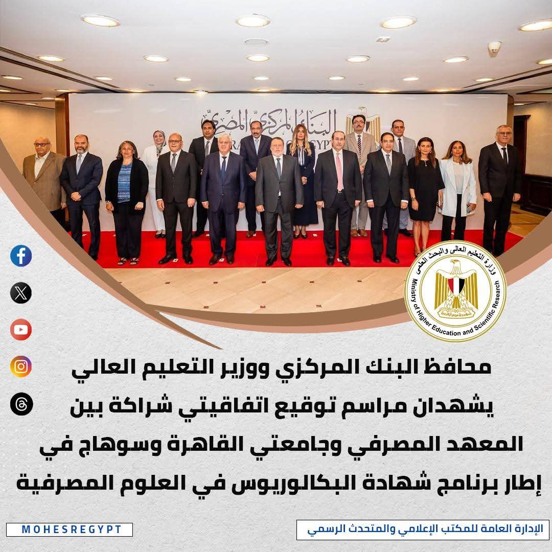 شهد حسن عبدالله محافظ البنك المركزي المصري، والدكتور أيمن عاشور وزير التعليم العالي والبحث العلمي، مراسم توقيع اتفاقيتي شراكة بين المعهد المصرفي المصري وكل من جامعة القاهرة وجامعة سوهاج، للمشاركة في البرنامج التعليمي الجديد بدءًا من العام الدراسي 2025/2026، وخلال الاجتماع جدد الدكتور أيمن عاشور وزير التعليم العالي والبحث العلمي، شكره وتقديره لحسن عبدالله محافظ البنك المركزي المصري، على دعمه المستمر وتعاونه المثمر في إطلاق هذا البرنامج الوطني الهام مؤكدًا أن التعاون بين وزارة التعليم العالي والبنك المركزي، يعكس التزام الدولة بتطوير التعليم المصرفي وتعزيز بناء الكفاءات الوطنية التي تساهم في دفع عجلة التنمية الاقتصادية والاجتماعية في مصر.