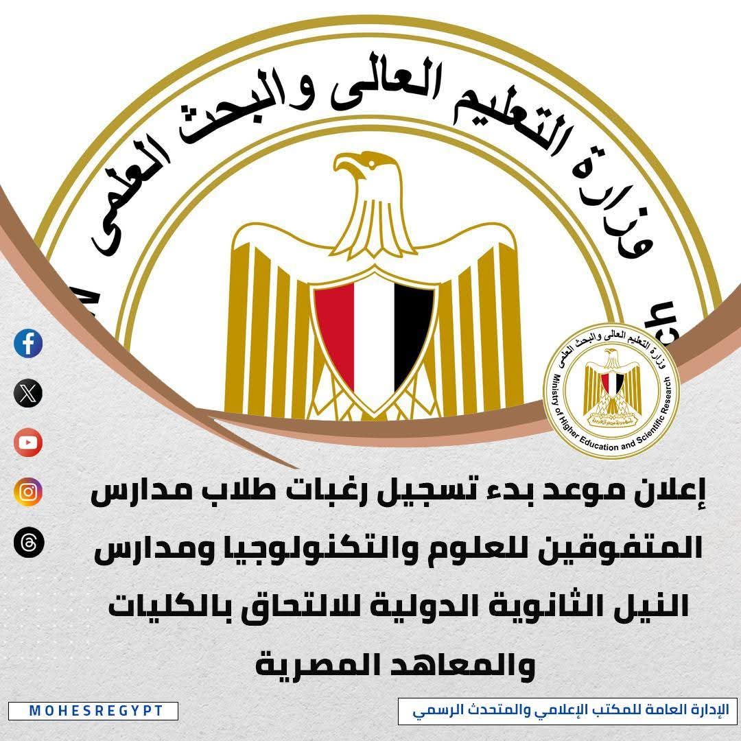 أعلنت وزارة التعليم العالي والبحث العلمي عن بدء تسجيل رغبات طلاب مدارس المتفوقين للعلوم والتكنولوجيا ومدارس النيل الثانوية الدولية للالتحاق بالكليات والمعاهد المصرية، وذلك عبر موقع التنسيق الإلكتروني: