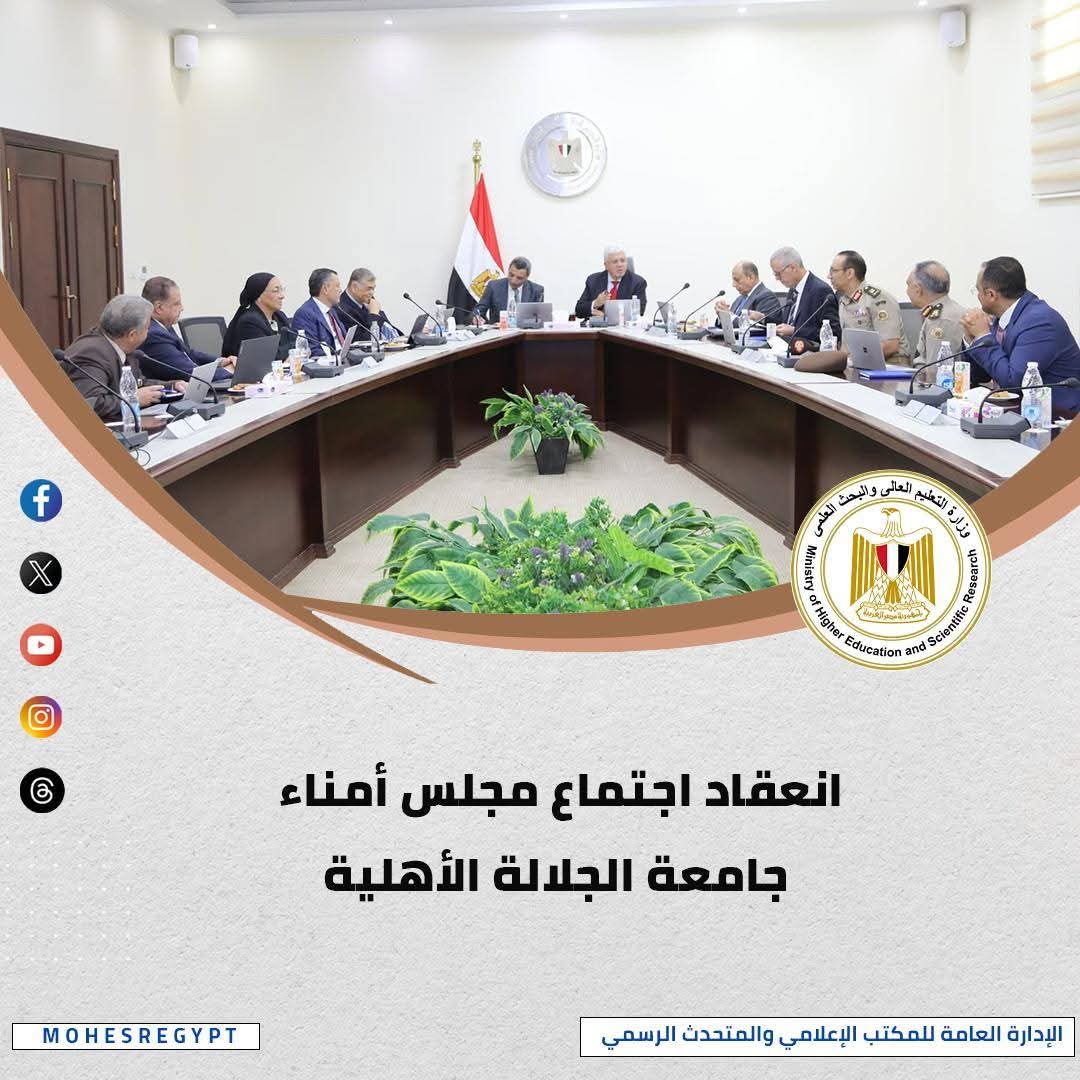 وبدعوة من الدكتور أيمن عاشور، وزير التعليم العالي والبحث العلمي، انعقدت الجلسة الأولى لمجلس أمناء جامعة الجلالة الأهلية، وخلال الاجتماع أكد الدكتور أيمن عاشور أن تجربة الجامعات الأهلية حققت نجاحًا لافتًا منذ نشأتها، وتُعد إضافة قوية لمنظومة التعليم العالي والبحث العلمي، موضحًا أن أهدافها تتمثل في تحقيق تعليم عالٍ يواكب التغيرات العالمية ويلبي متطلبات التنمية المستدامة للدولة، مع الحرص على تقديم برامج دراسية حديثة، والاهتمام بالعلوم والتكنولوجيا، ودعم الابتكار وريادة الأعمال، وخلال الجلسة، تم الإعلان عن تشكيل مجلس الأمناء الجديد، حيث تم اختيار الدكتور أشرف حاتم رئيسًا للمجلس، والدكتور أحمد عيسى نائبًا للرئيس، والدكتورة مها الرباط أمينًا للمجلس.