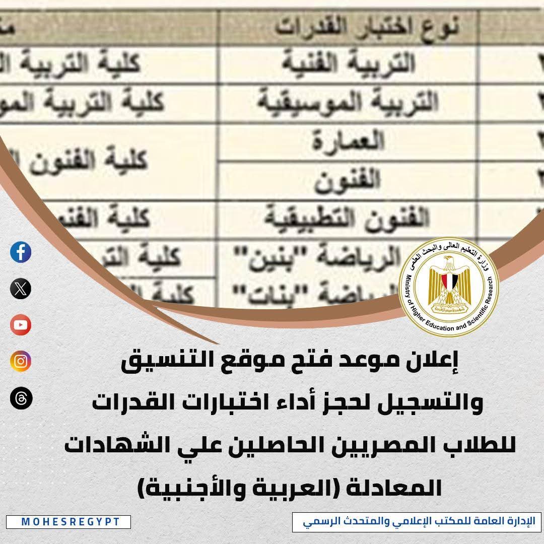 وقامت وزارة التعليم العالي والبحث العلمي بعقد اختبارات القدرات للطلاب المصريين الحاصلين علي الشهادات المعادلة (العربية والأجنبية) لهذا العام 2025، والراغبين في الالتحاق بالكليات التي يشترط القبول بها اجتياز اختبارات القدرات المؤهلة لها، وتيسيرًا على أبنائنا الطلاب وأولياء الأمور، تقرر إتاحة الفرصة أمام هؤلاء الطلاب لتسجيل رغبتهم في أداء اختبارات القدرات إلكترونيًا عن طريق موقع التنسيق الإلكتروني على شبكة الإنترنت: https://tansik.digital.gov.eg