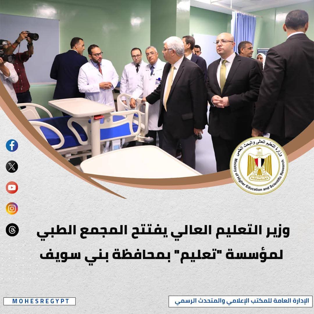 افتتح د.أيمن عاشور وزير التعليم العالي والبحث العلمي، المجمع الطبي لمؤسسة "تعليم"، وتفقد الوزير ومرافقوه أقسام المجمع الطبي لمؤسسة "تعليم" وإمكاناته الطبية، حيث أشاد الوزير بما يضمه من تجهيزات حديثة وكوادر مؤهلة، مؤكدًا أن افتتاح هذا الصرح الطبي يمثل إضافة نوعية للمنظومة الصحية والتعليمية في مصر، مشيرًا إلى أن المجمع الطبي سيسهم في تدريب طلاب كليات الطب وتأهيلهم مهنيًا، فضلا عن تقديم خدمات علاجية متميزة لأبناء محافظة بني سويف، والمحافظات المجاورة، بما يواكب أهداف الدولة في الارتقاء بجودة التعليم والرعاية الصحية، وفقًا لأهداف ومبادئ الإستراتيجية الوطنية للتعليم العالي والبحث العلمي التي تتماشى مع رؤية مصر 2030.