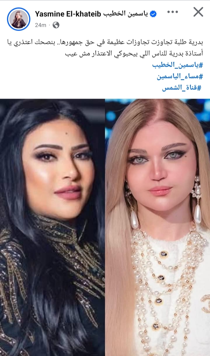 وكتبت ياسمين الخطيب من خلال حسابها الرسمي عبر موقع التواصل الاجتماعي فيسبوك، قالت: "بدرية طلبة تجاوزت تجاوزات عظيمة في حق جمهورها.. بنصحك اعتذري يا أستاذة بدرية للناس اللي بيحبوكي الاعتذار مش عيب".