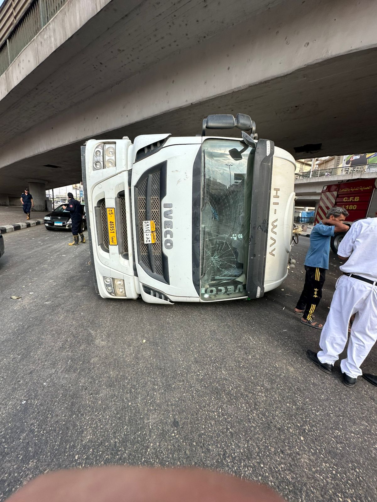 استخراج سائق وتباع احتجزا داخل سيارة نقل انقلبت أسفل كوبرى أكتوبر (صور)
