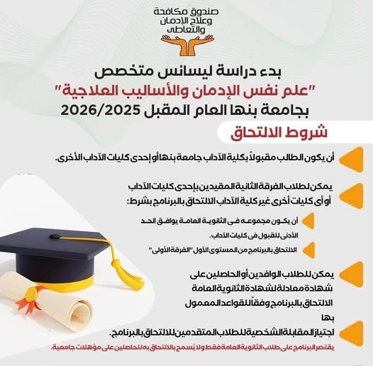 يبدأ صندوق مكافحة وعلاج الإدمان والتعاطي بالتعاون مع جامعة بنها بدء الدراسة ببرنامج نظام الساعات المعتمدة لمنح الخريج ليسانس متخصص عن "علم نفس الإدمان والأساليب العلاجية" بكلية الآداب بجامعة بنها اعتبارا من العام الدراسي المقبل 2025/ 2026 ،حيث يعد الأول من نوعه على مستوى الشرق الأوسط لإعداد خريج يمتلك المهارات والمعارف والمهنية بما يتيح له مواكبة تطور البحث العلمي في مجال الادمان وخدمة المجتمع وعلاج السلوكيات الإدمانية.