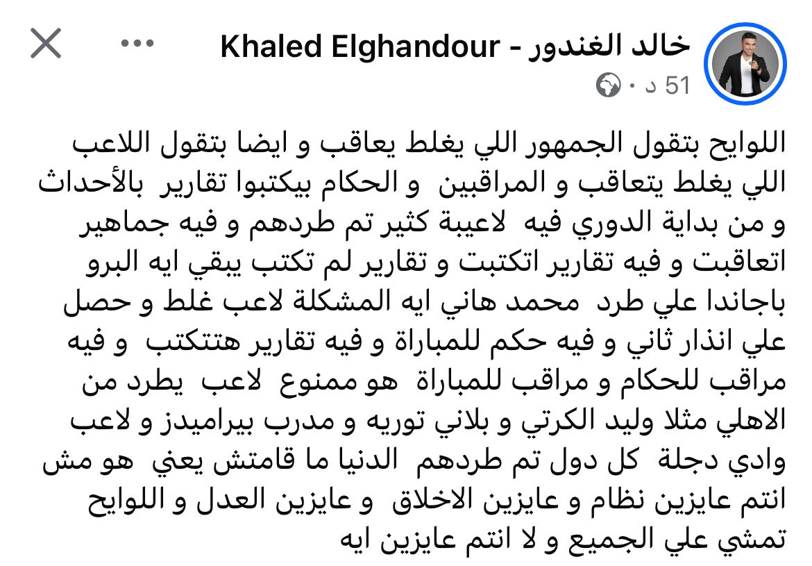 وكتب خالد الغندور عبر صفحته الرسمية على موقع التواصل الإجتماعي فيسبوك: اللوايح بتقول الجمهور اللي يغلط يعاقب و ايضا بتقول اللاعب اللي يغلط يتعاقب و المراقبين و الحكام بيكتبوا تقارير بالأحداث و من بداية الدوري فيه لاعيبة كثير تم طردهم و فيه جماهير اتعاقبت و فيه تقارير اتكتبت و تقارير لم تكتب يبقي ايه البرو باجاندا علي طرد محمد هاني.