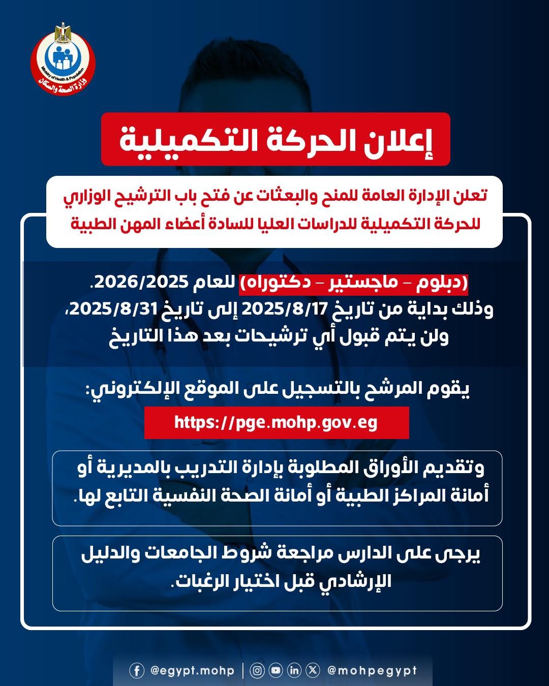 أعلنت الإدارة العامة للمنح والبعثات عن فتح باب الترشيح الوزاري للحركة التكميلية للدراسات العليا للسادة أعضاء المهن الطبية (دبلوم – ماجستير – دكتوراه) للعام 2025/2026.