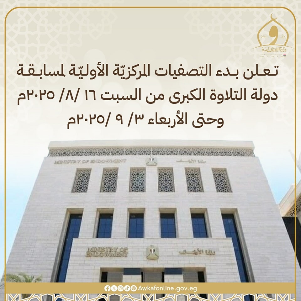 بدء التصفيات المركزيّة الأوليّة لمسابقة دولة التلاوة الكبرى من السبت ١٦ /٨/ ٢٠٢٥م وحتى الأربعاء ٣/ ٩ /٢٠٢٥م