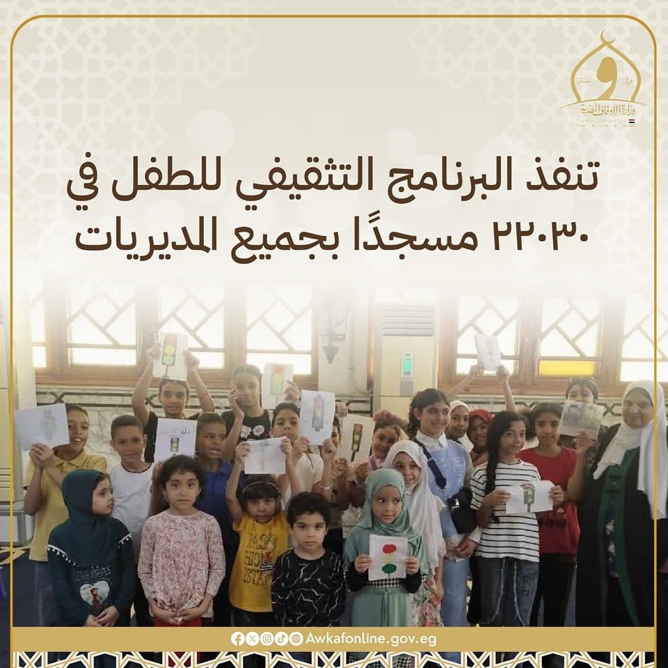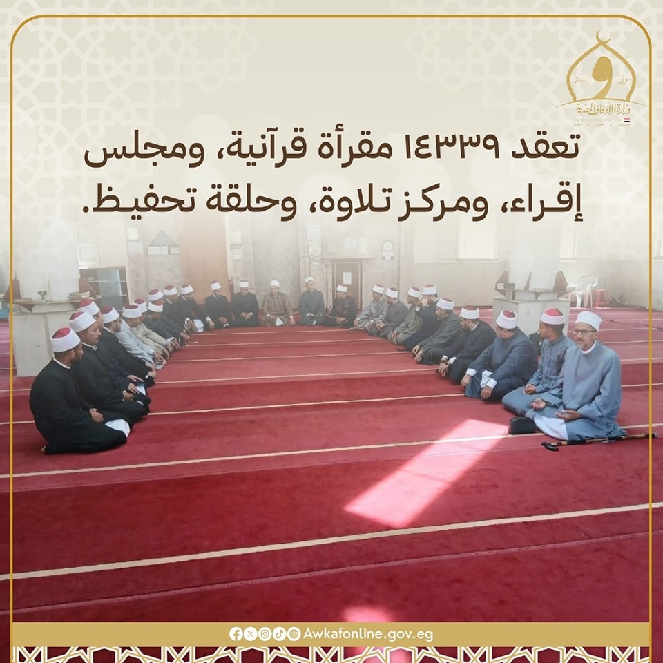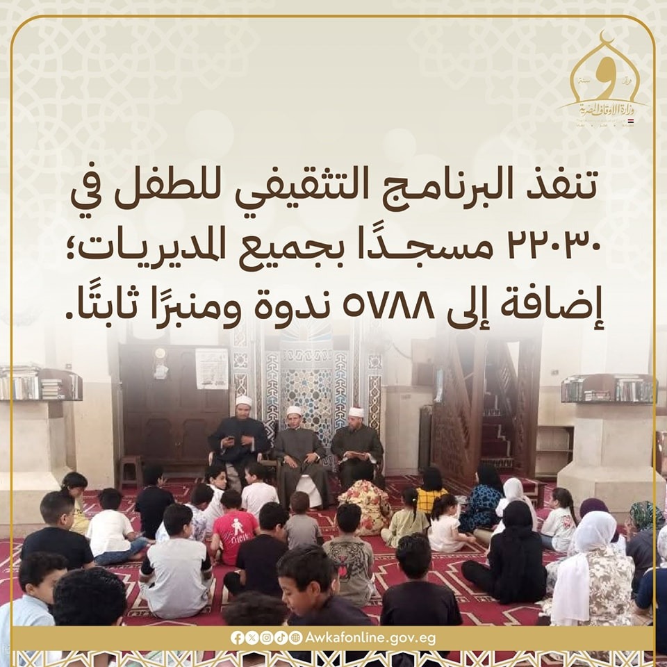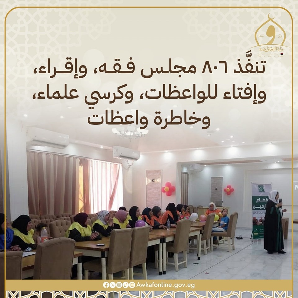 نفَّذت وزارة الأوقاف ٨٠٦ مجلس فقه، وإقراء، وإفتاء للواعظات، وكرسي علماء، وملتقى فكري، وخاطرة واعظات؛ ٢١٦٨ درسًا منهجيًّا للأئمة والواعظات، وأسبوعًا ثقافيًّا، وقافلة دعوية؛ إلى جانب تنفيذ البرنامج التثقيفي للطفل في ٢٢٠٣٠ مسجدًا بجميع المديريات؛ إضافة إلى ٥٧٨٨ ندوة ثقافية وعلمية ومنبرًا ثابتًا، ومجلس علم وذكر، وصحة إنجابية، ولقاء الجمعة للطفل.