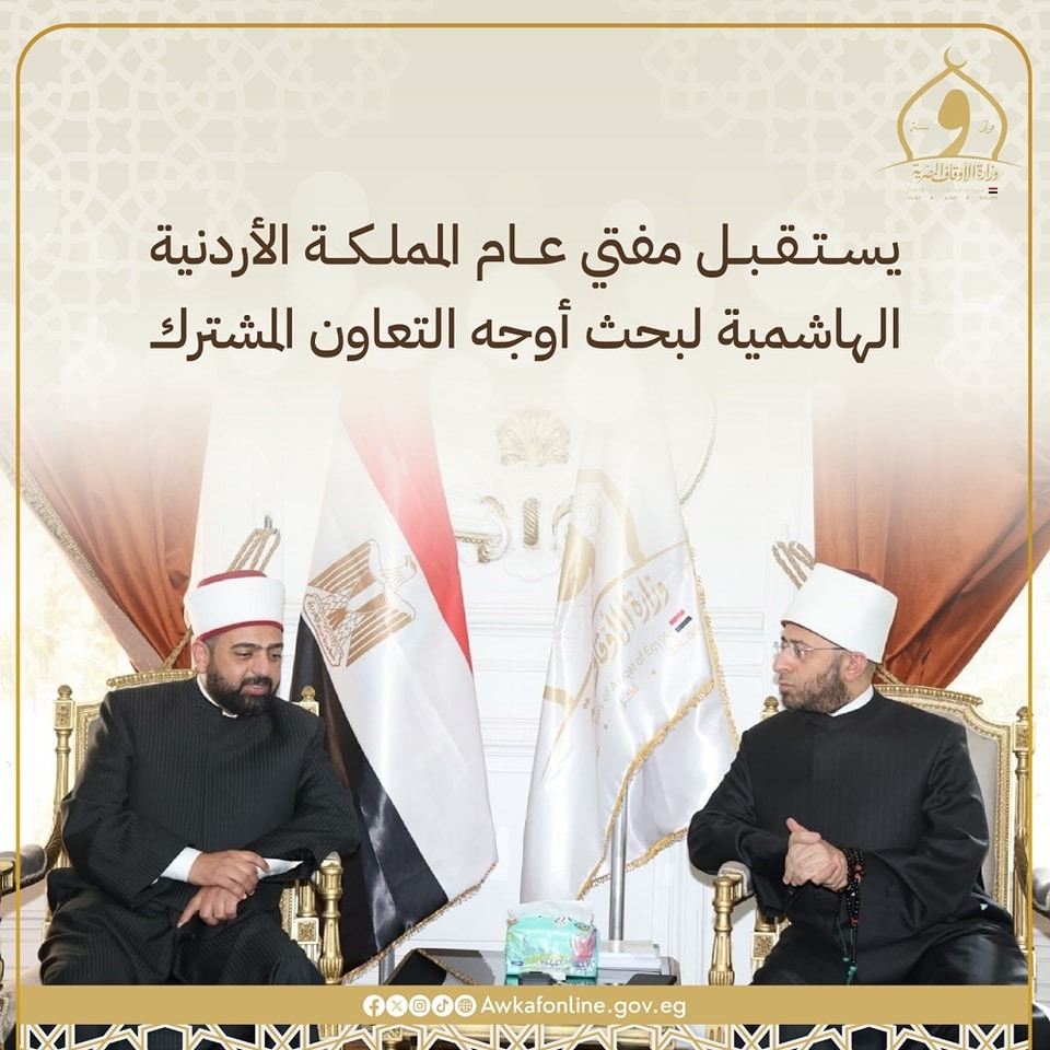 استقبل الأستاذ الدكتور أسامة الأزهري، وزير الأوقاف، سماحة الدكتور أحمد الحسنات، مفتي عام المملكة الأردنية الهاشمية، وذلك بمقرّ المجلس الأعلى للشئون الإسلامية بالقاهرة، لبحث أوجه التعاون المشترك في مجالات الدعوة ونشر الفكر الوسطي المستنير.