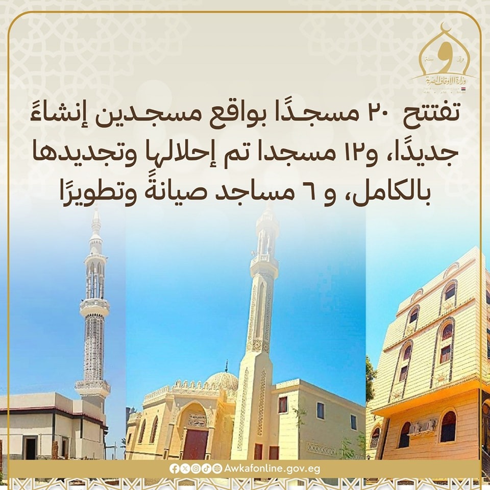 افتتحت وزارة الأوقاف ٢٠ مسجدًا على مستوى الجمهورية، بواقع مسجدين إنشاءً جديدًا، و١٣ مسجدا تم إحلالها وتجديدها بالكامل، و٦ مساجد صيانةً وتطويرًا.