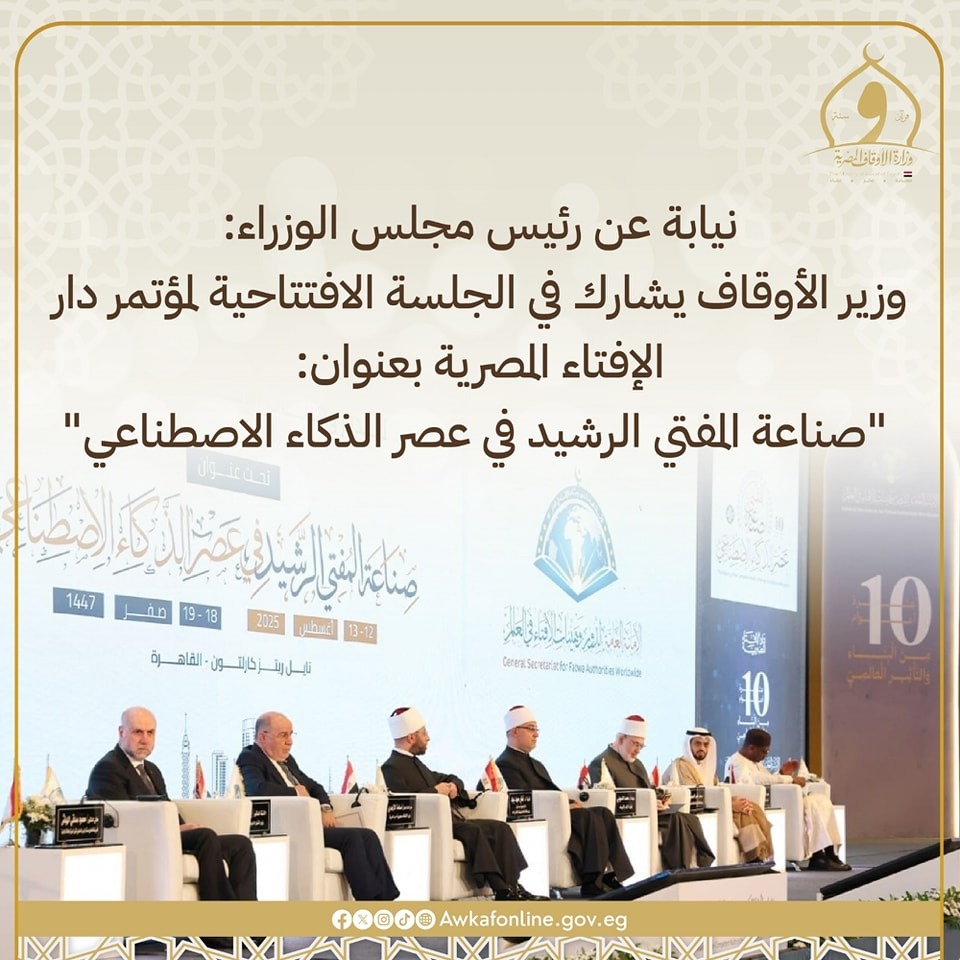 بإنابة كريمة من دولة رئيس مجلس الوزراء، الدكتور المهندس مصطفى مدبولي، شهد الأستاذ الدكتور أسامة الأزهري، وزير الأوقاف، الثلاثاء ١٢ أغسطس، فعاليات الجلسة الافتتاحية للمؤتمر العالمي العاشر للإفتاء، الذي تنظِّمه دار الإفتاء المصرية والأمانة العامة لدُور وهيئات الإفتاء في العالم، برعاية كريمة من فخامة الرئيس عبد الفتاح السيسي - رئيس الجمهورية، وبرئاسة فضيلة الأستاذ الدكتور نظير محمد عياد - مفتي الديار المصرية، ويُعقد المؤتمر هذا العام تحت عنوان: "صناعة المفتي الرشيد في عصر الذكاء الاصطناعي"، بحضور دوليّ رفيع يضم مفتين ووزراء وعلماء، إلى جانب خبراء التكنولوجيا من مختلف دول العالم.
