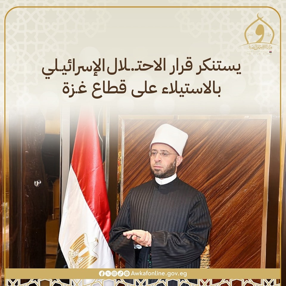 أعرب الأستاذ الدكتور أسامة الأزهري، وزير الأوقاف، عن استنكاره الشديد وإدانته التامَّة لقرار مجلس وزراء الاحتلال بالاستيلاء على كامل قطاع غزة، مؤكّدًا أن التلاعب بالألفاظ بلجوء الاحتلال إلى استخدام لفظة "استيلاء" دون "احتلال" إنما هو تدليس لا يُعفي المحتل من التبعات القانونية والإنسانية المترتبة على عدوانه الغاشم.