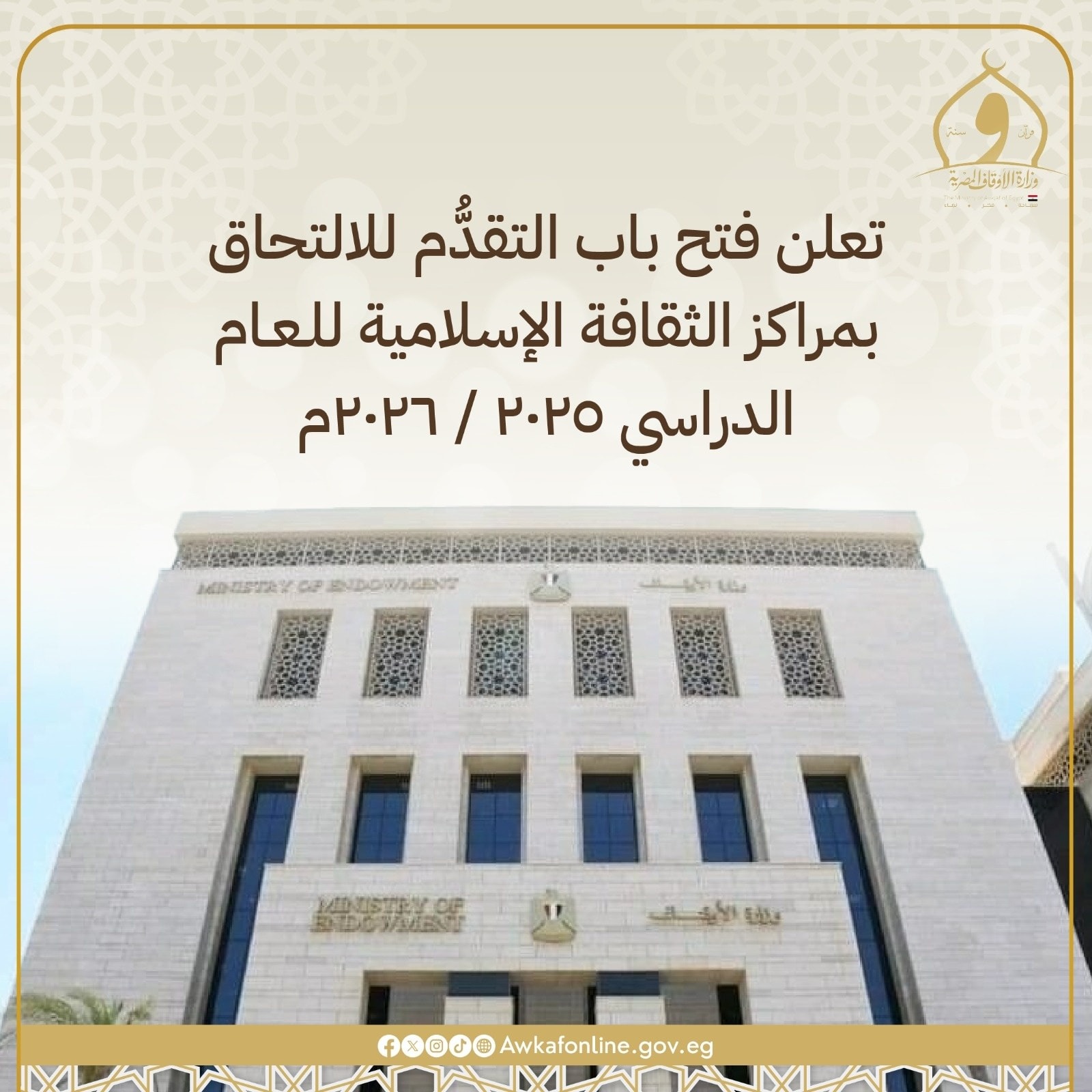 أعلنت وزارة الأوقاف فتح باب التقدُّم للالتحاق بمراكز الثقافة الإسلامية التابعة لها، للعام الدراسي ٢٠٢٥ / ٢٠٢٦م، وذلك للراغبين من الحاصلين على مؤهلات عليا أو متوسطة، من الجنسين.