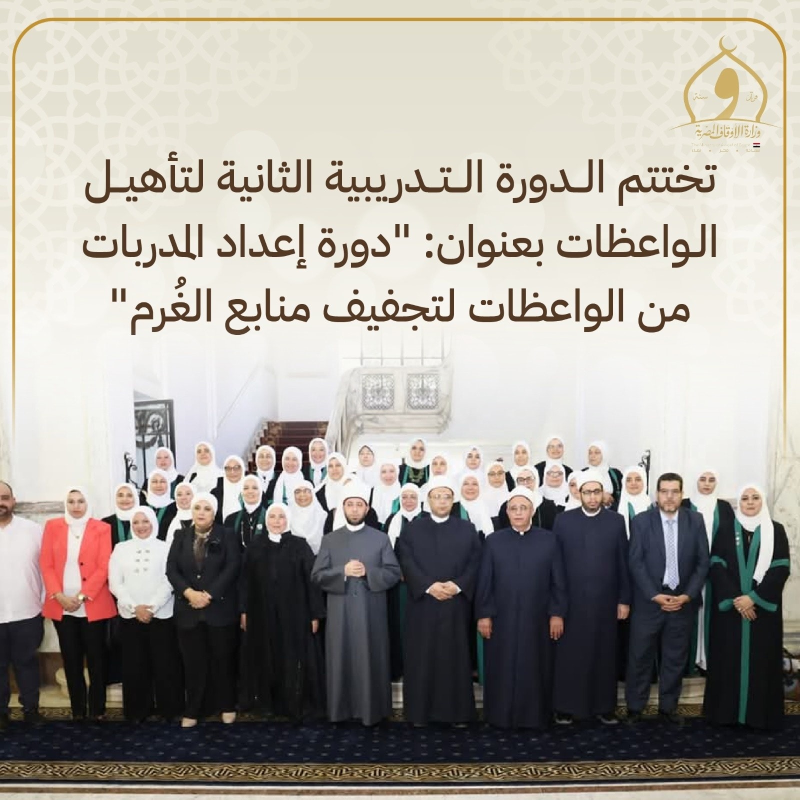 اختتمت وزارة الأوقاف، الخميس ٧ اغسطس، فعاليات الدورة التدريبية الثانية لتأهيل الواعظات بعنوان: "دورة إعداد المدربات من الواعظات لتجفيف منابع الغُرم"، والتي أُقيمت تحت رعاية الأستاذ الدكتور أسامة الأزهري، وزير الأوقاف، وبالتعاون مع مؤسسة "مصر الخير"، وذلك بمقرّ المجلس الأعلى للشئون الإسلامية، بحضور عدد من قيادات الوزارة وممثِّلي المؤسَّسة.