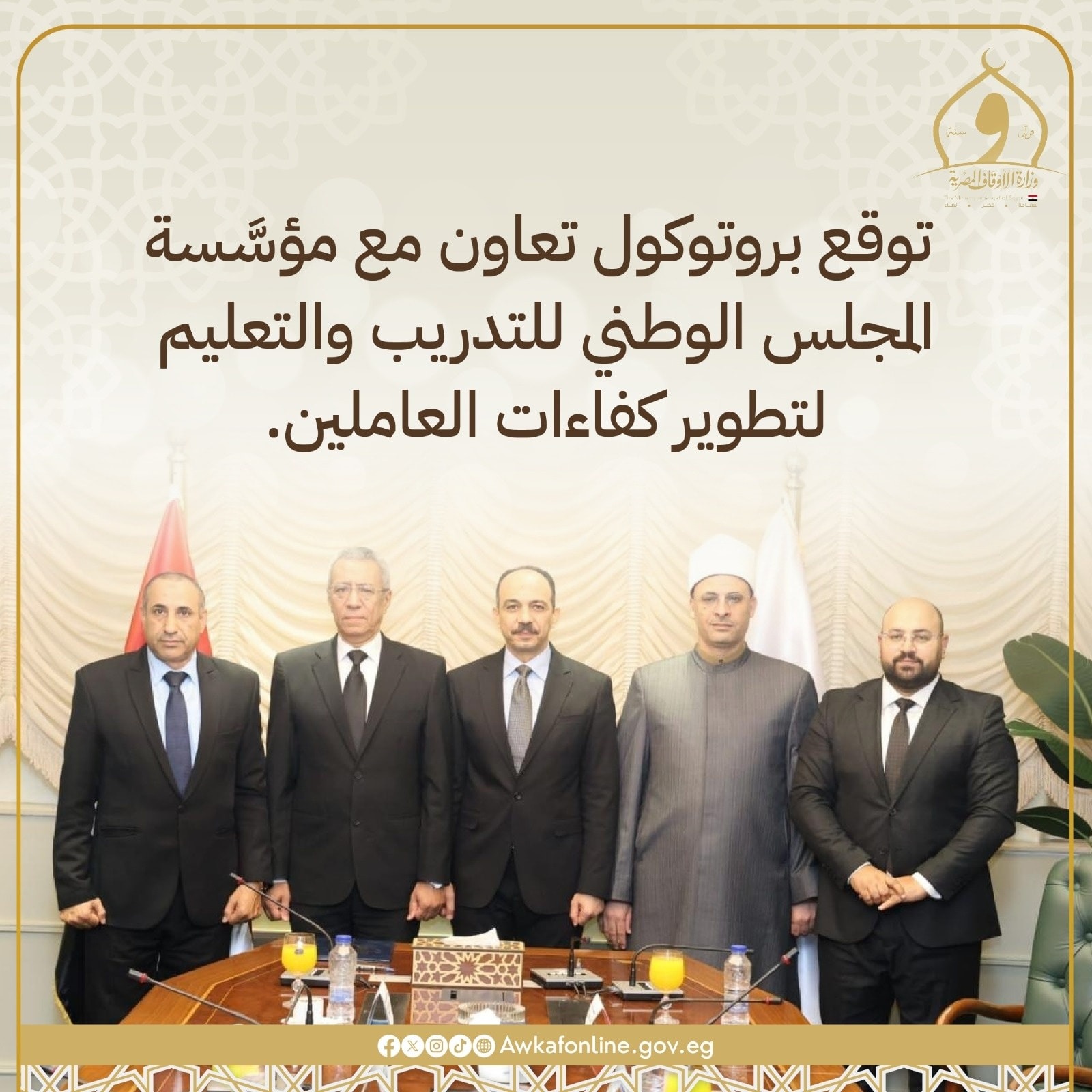 وقعت وزارة الأوقاف، الإثنين ١١ أغسطس، بروتوكول تعاون مع مؤسَّسة المجلس الوطنيّ للتدريب والتعليم؛ وذلك حرصًا على تطوير كفاءات العاملين ورفع قدرتهم المهنية، وتوحيد المفاهيم الأساسية للأئمة والدعاة.