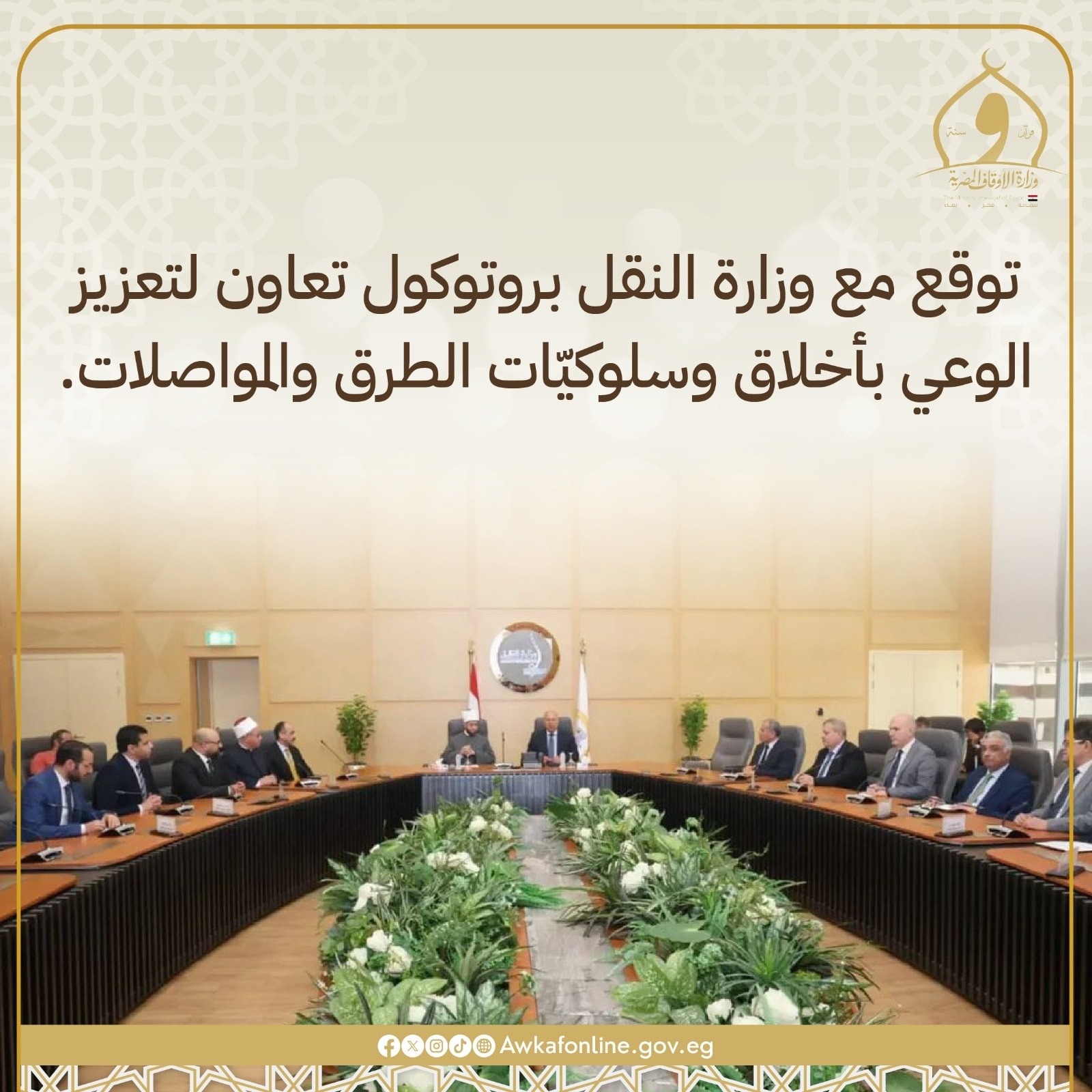 تحت شعار "صحح مفاهيمك - سلامتك تهمّنا" وفي إطار جهود وزارتي الأوقاف والنقل، للتصدي للسلوكيات السلبية لمستخدمي الطرق ووسائل النقل والمواصلات العامة للمحافظة على الأرواح والممتلكات العامة؛ النقل والأوقاف يوقِّعان الجمعة ٨ أغسطس ٢٠٢٥م، بروتوكول تعاون لتعزيز الوعي الثقافي والديني لدي المواطنين بأخلاقيات استخدام الطرق، والتعامل مع وسائل النقل والمواصلات للمحافظة على الأرواح والممتلكات العامة.