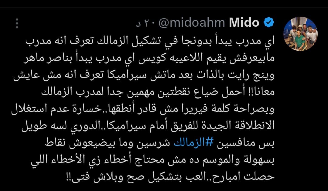 وكتب ميدو عبر حسابه الرسمي على منصة "إكس": "أي مدرب يبدأ بدونجا في تشكيل الزمالك، تعرف إنه مدرب لا يعرف تقييم اللاعيبن كويس.. أي مدرب يبدأ بناصر ماهر وينج رايت بالذات بعد ماتش سيراميكا تعرف إنه مش عايش معانا!!".