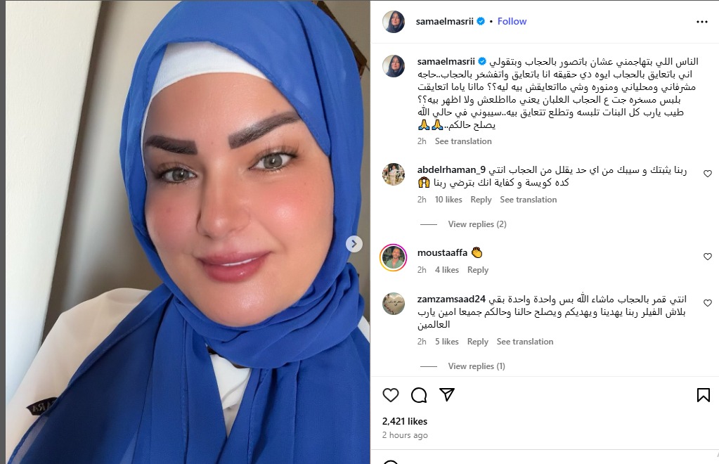 وفي ردها على الهجوم، نشرت سما المصري تدوينة عبر حسابها الرسمي على "إنستجرام"، أوضحت فيها أن الحجاب بالنسبة لها يمثل مصدر "شرف وزينة"، مؤكدة أنها ترتديه عن قناعة كاملة وتتباهى به كما كانت تفعل سابقًا بملابسها الأخرى.