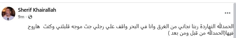 وكتب خير الله عبر حسابه على "فيسبوك": "الحمد لله النهاردة ربنا نجاني من الغرق، وأنا في البحر واقف على رجلي جت موجة قلبتني وكنت هروح فيها.. الحمد لله من قبل ومن بعد".