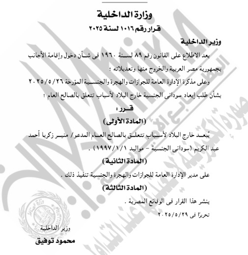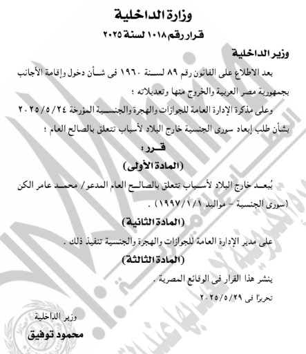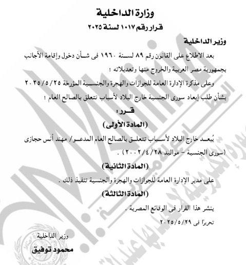 نشرت الجريدة الرسمية اليوم الإثنين نص قرار وزارة الداخلية بإبعاد 3 مواطنين أجانب خارج مصر، لأسباب تتعلق بالصالح العام.